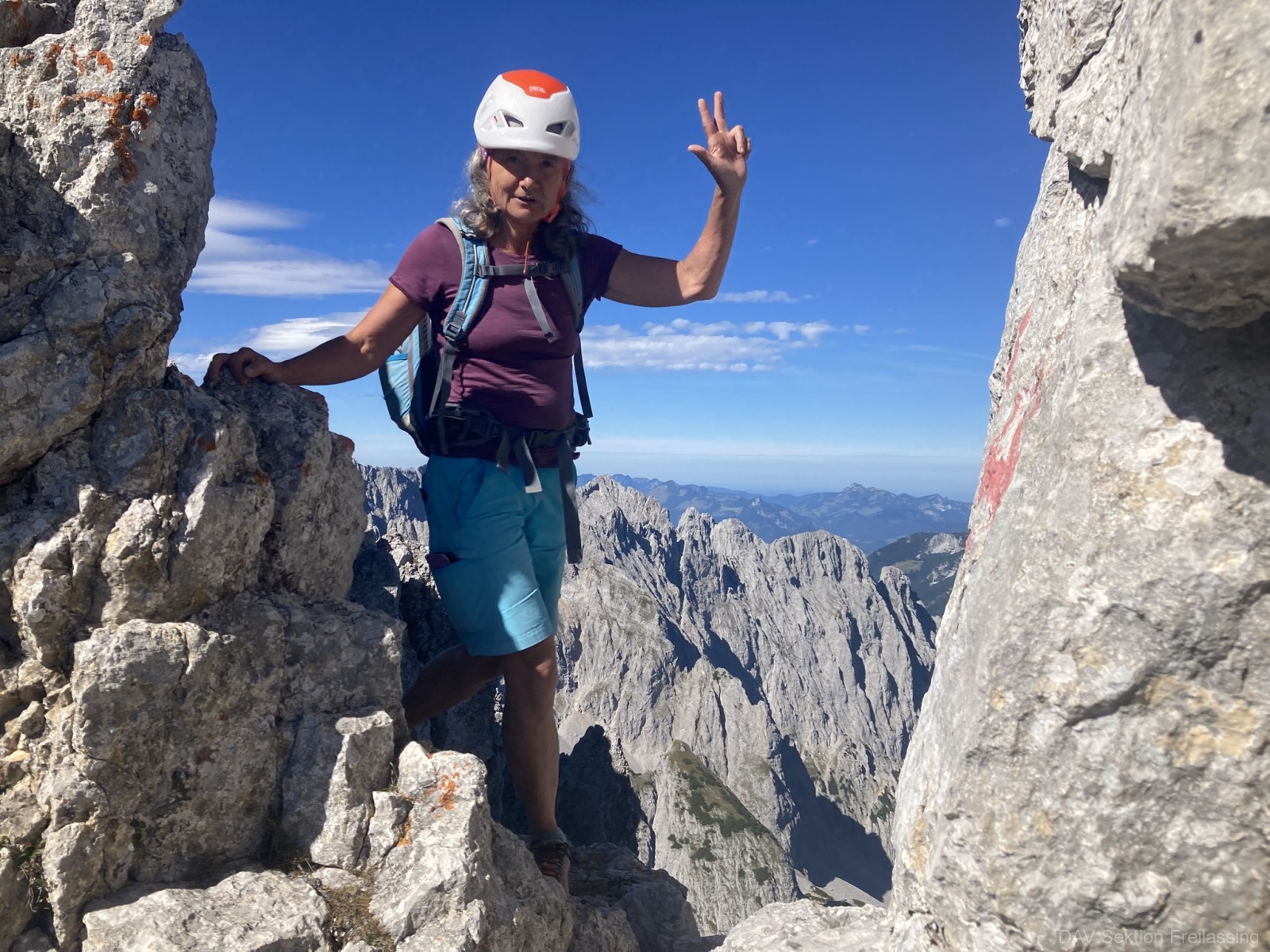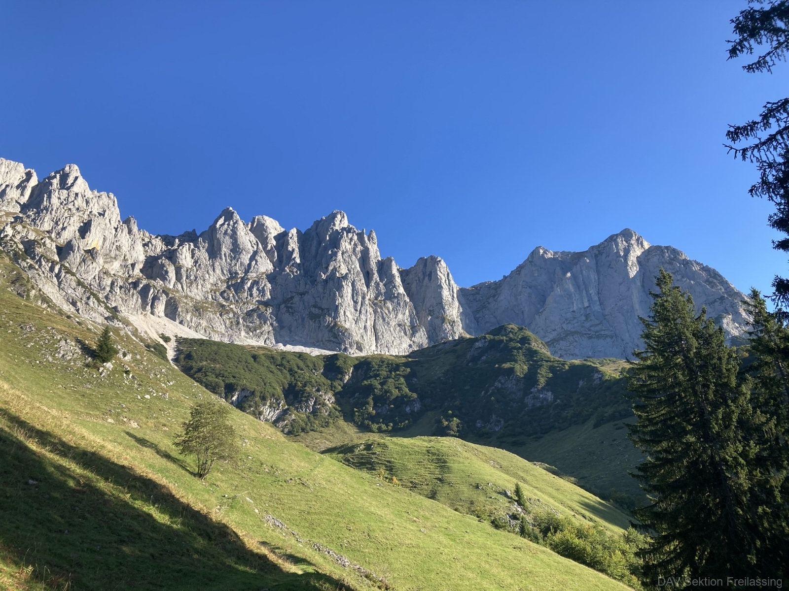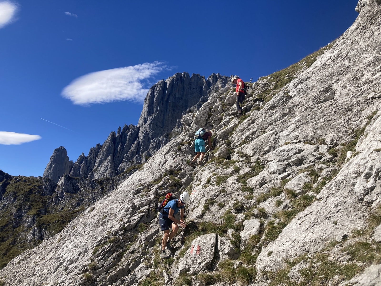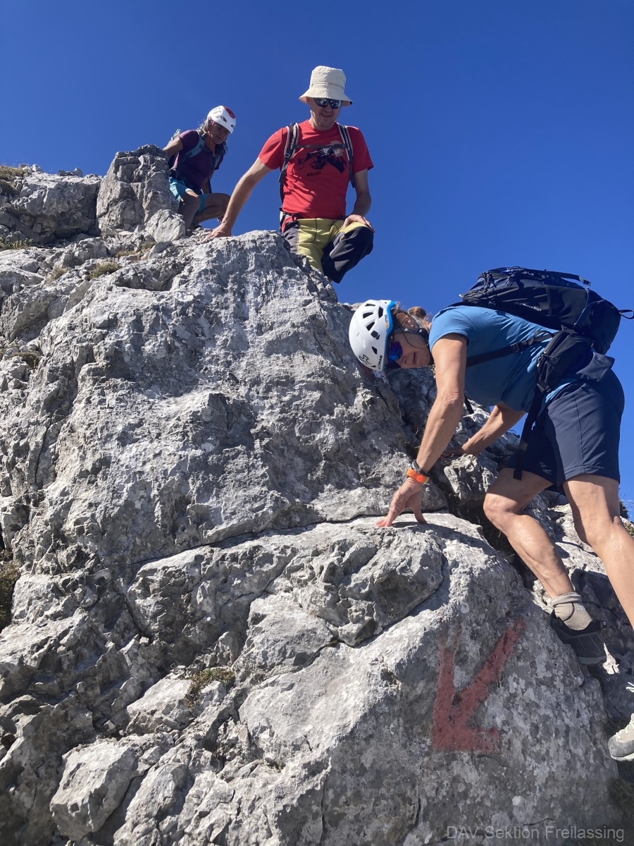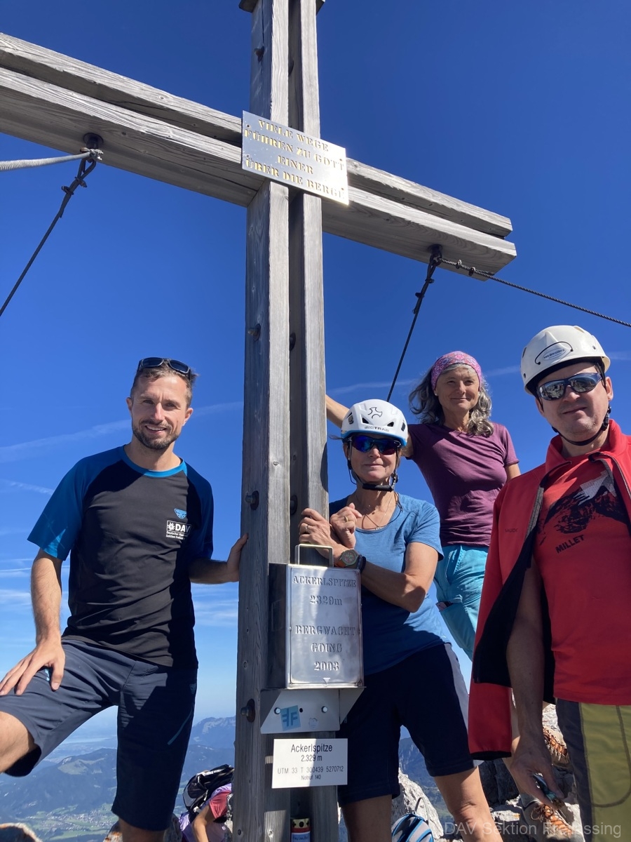 Wer die Berge liebt, steht auch mal früh auf – So trafen sich 4 DAV Mitglieder der Sektion Freilassing schon vor Sonnenaufgang am Badylon Parkplatz, um in Richtung Wilder Kaiser aufzubrechen. Als Tourenziel hat man sich die Ackerlspitze und die Maukspitze vorgenommen. Los ging es am Parkplatz bei noch kühlerer Morgenluft mit dem Aufstieg zur Ackerlhütte und unter die glatten Wände des Waxensteinerturms. Ab hier hieß es dann Helm auf und Hand an den Felsen. Bei leichter Kletterei wurde die erste Felsstufe bis zum Niedersessel erreicht. Hier galt es dann die nächste steile Wandstufe zu bezwingen. Diese doch sehr luftige Kletterei rauf zum Hochsessel konnte, auch mit Hilfe von in den Felsen eingelassenen Eisenringen, von den Teilnehmern gut bewältigt werden. Der weitere Verlauf führte über Rinnen zur Ackerlschneid und weiter über steiles Gelände zur Ackerlspitze. Nach verdienter erster Gipfelpause ging es den Weg zurück zur Ackerlschneid und weiter über den Grat zur Maukspitze. Auch hier genoss man den Weitblick bei strahlend blauem Himmel und die noch übrige Gipfelbrotzeit wurde verzehrt. Im Abstieg hieß es nochmal die Konzentration hoch zu halten, da eine steile Schrofenrampe bis zum Niedersessel und von dort die schon im Aufstieg in Kletterei gemeisterte Wandstufe runter bewältigt werden musste. Nach einem Einkehrschwung bei der Ackerlhütte bleibt für jeden der Bergsteiger ein wunderschöner Bergtag in grandioser Umgebung.
