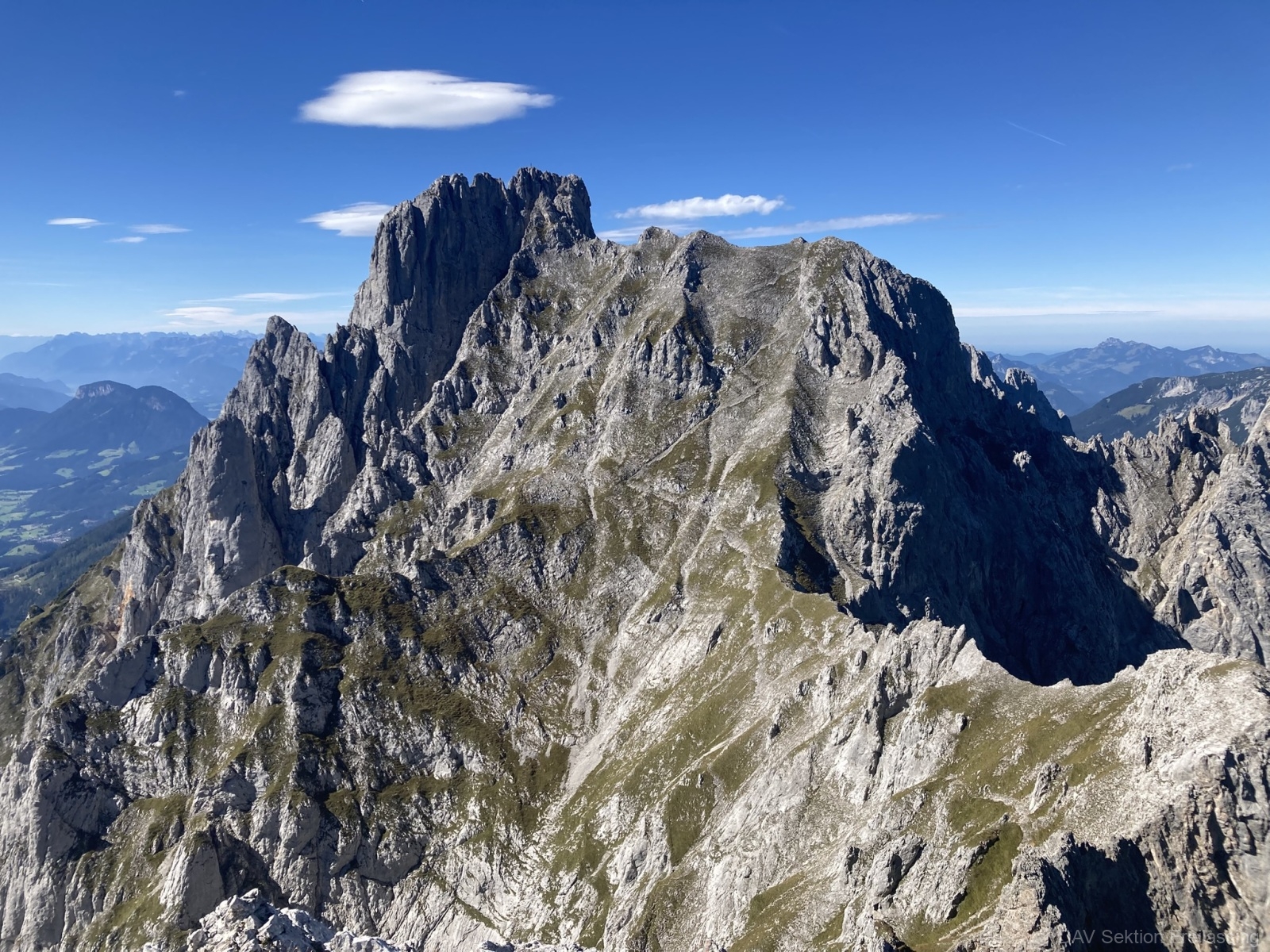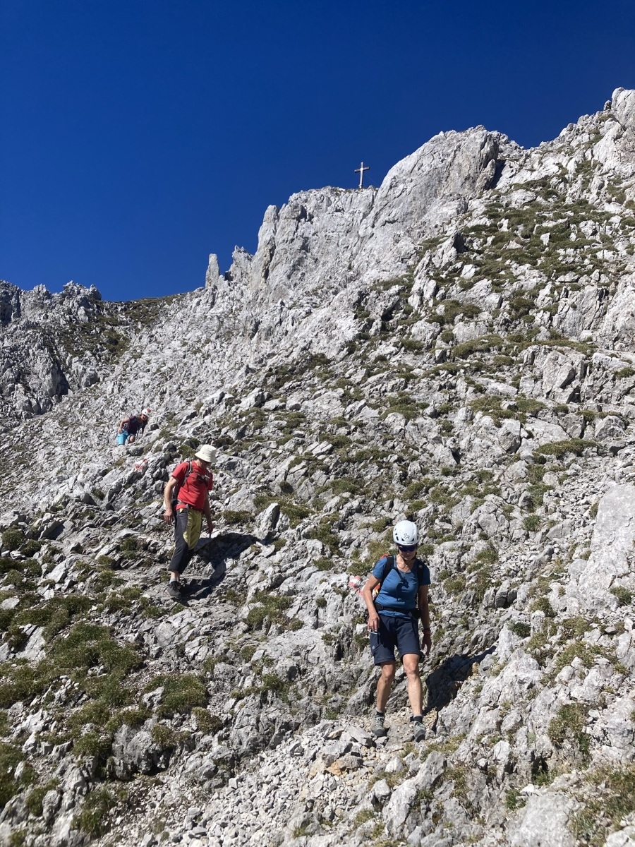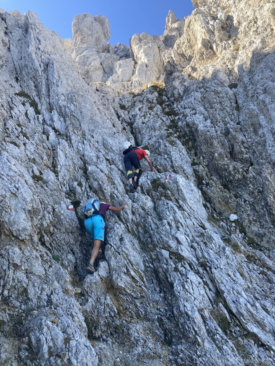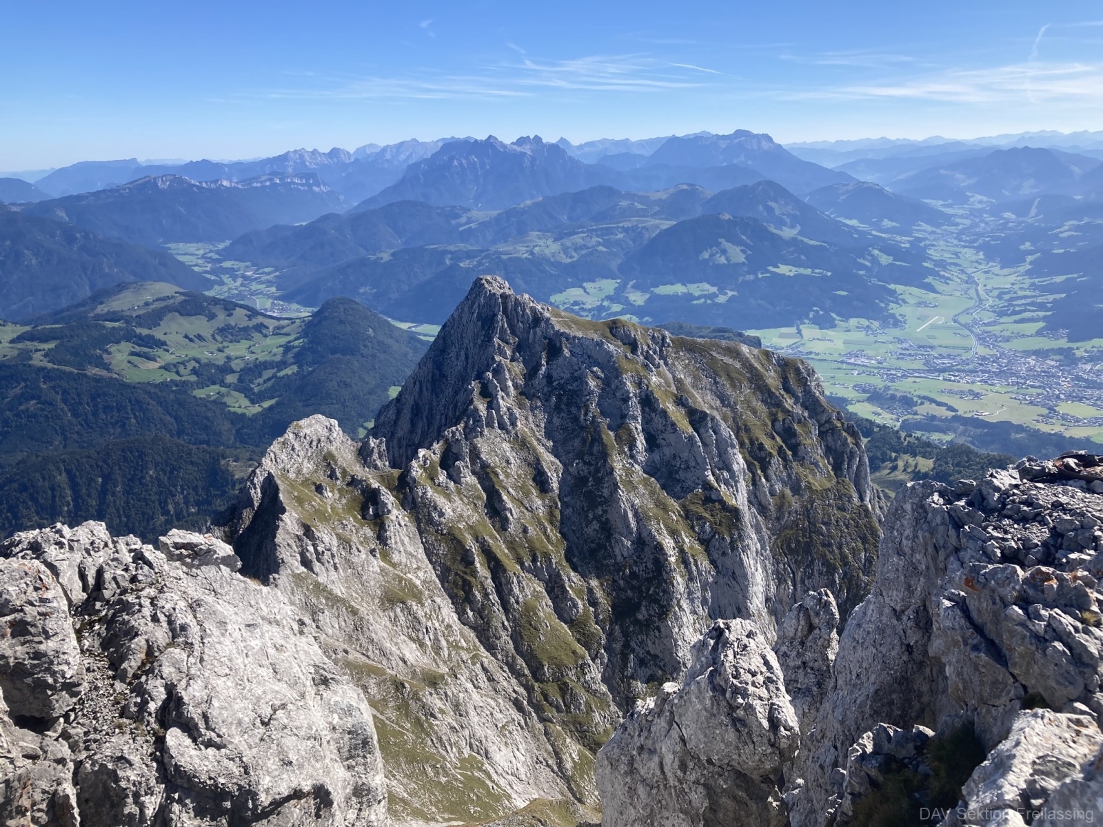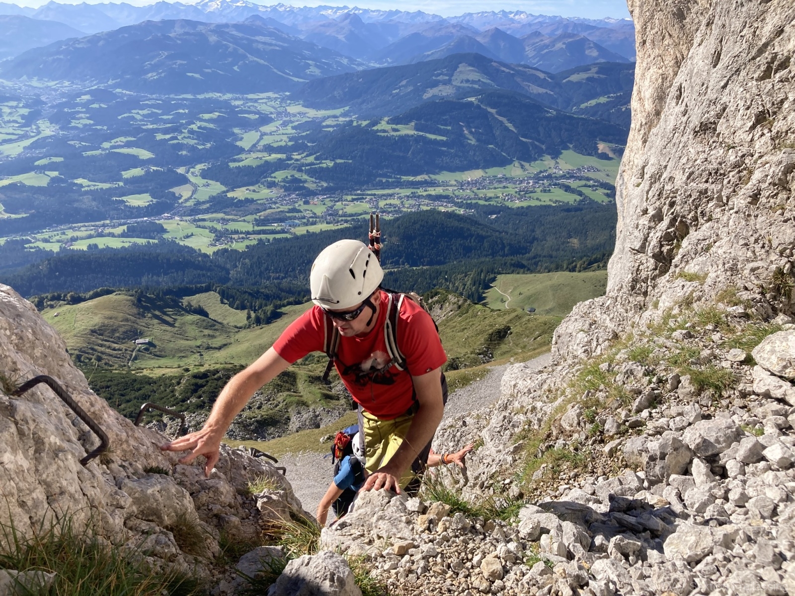 Wer die Berge liebt, steht auch mal früh auf – So trafen sich 4 DAV Mitglieder der Sektion Freilassing schon vor Sonnenaufgang am Badylon Parkplatz, um in Richtung Wilder Kaiser aufzubrechen. Als Tourenziel hat man sich die Ackerlspitze und die Maukspitze vorgenommen. Los ging es am Parkplatz bei noch kühlerer Morgenluft mit dem Aufstieg zur Ackerlhütte und unter die glatten Wände des Waxensteinerturms. Ab hier hieß es dann Helm auf und Hand an den Felsen. Bei leichter Kletterei wurde die erste Felsstufe bis zum Niedersessel erreicht. Hier galt es dann die nächste steile Wandstufe zu bezwingen. Diese doch sehr luftige Kletterei rauf zum Hochsessel konnte, auch mit Hilfe von in den Felsen eingelassenen Eisenringen, von den Teilnehmern gut bewältigt werden. Der weitere Verlauf führte über Rinnen zur Ackerlschneid und weiter über steiles Gelände zur Ackerlspitze. Nach verdienter erster Gipfelpause ging es den Weg zurück zur Ackerlschneid und weiter über den Grat zur Maukspitze. Auch hier genoss man den Weitblick bei strahlend blauem Himmel und die noch übrige Gipfelbrotzeit wurde verzehrt. Im Abstieg hieß es nochmal die Konzentration hoch zu halten, da eine steile Schrofenrampe bis zum Niedersessel und von dort die schon im Aufstieg in Kletterei gemeisterte Wandstufe runter bewältigt werden musste. Nach einem Einkehrschwung bei der Ackerlhütte bleibt für jeden der Bergsteiger ein wunderschöner Bergtag in grandioser Umgebung.