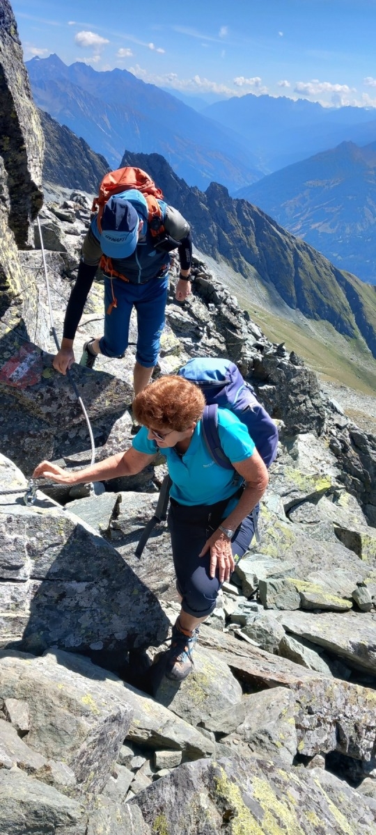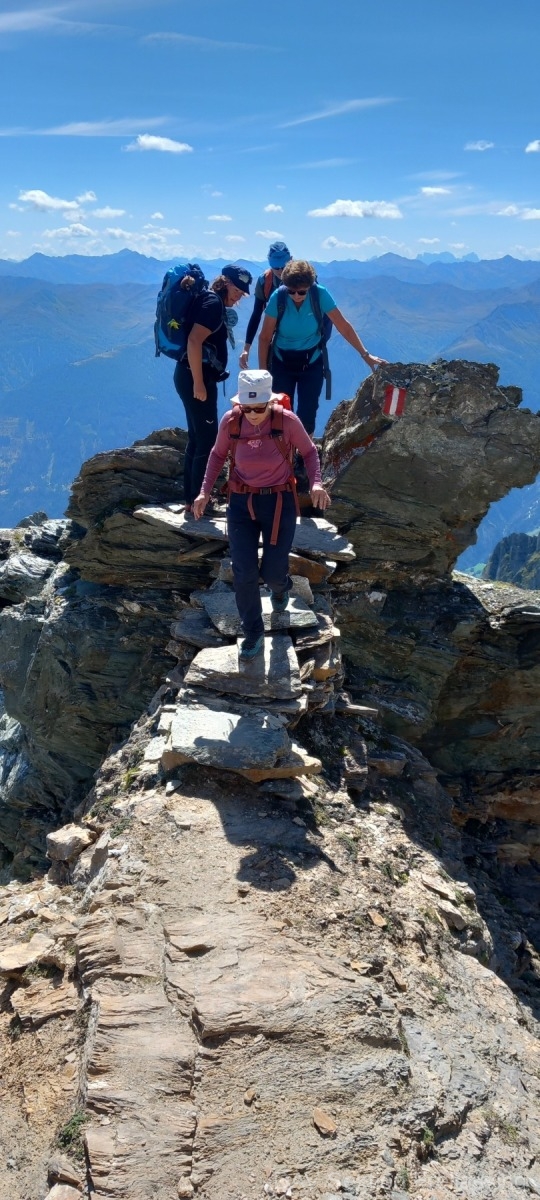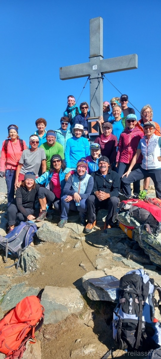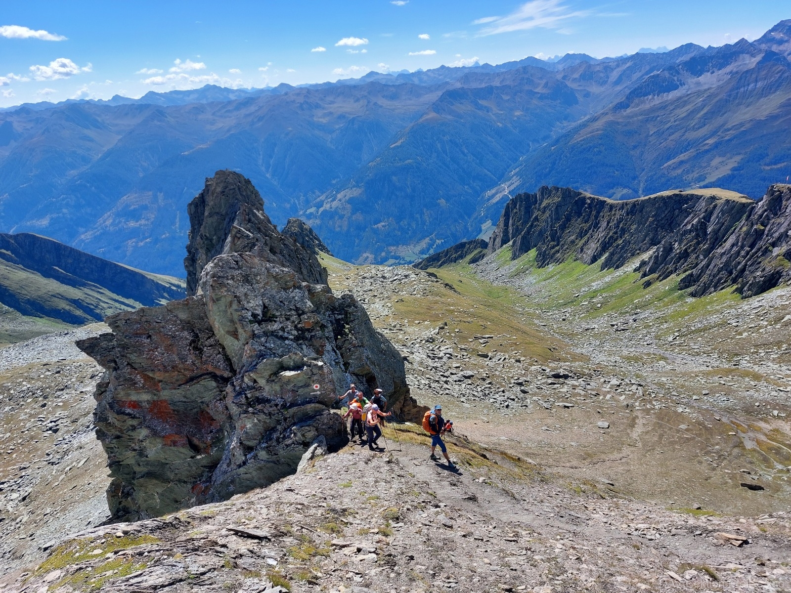 Am nächsten Tag ging es hoch hinauf. Durch ein immer steiler werdendes Kar und abschließend leichter, mit Drahtseilen gut abgesicherter Kletterei, erreichten alle nach 1 ½ Stunden und 470 Höhenmeter den Gipfel des Säulkopf (3209 m). Die Aussicht reichte vom Großglockner über Großvenediger zu den Dolomiten und den Karnischen Alpen. Auf gleichem Weg hieß es vorsichtig absteigen bis kurz vor die Hütte, wo eine ausgiebige Rast eingelegt wurde. Für den Nachmittag gab es die Möglichkeit, mit dem Rauh Kopf (3079 m) einen zweiten 3000er zu ersteigen. Die Hälfte der Teilnehmer nahm diese Möglichkeit wahr. An der Kälberscharte begann der Aufstieg über den steilen, aber gut begehbaren SO-Rücken. Die letzten Meter zum Gipfel mussten auf einem schmalen, aber wieder mit Drahtseilen gut versicherten Grat zurückgelegt werden. Nach 350 Höhenmeter und einer Stunde Aufstieg erreichten die Bergsteiger den Gipfel mit seiner herrlichen Aussicht. Konzentriert wurde auf dem Anstiegsweg wieder abgestiegen zur Hütte. Ein unterhaltsamer und geselliger Hüttenabend rundete diesen schönen Tag ab.
