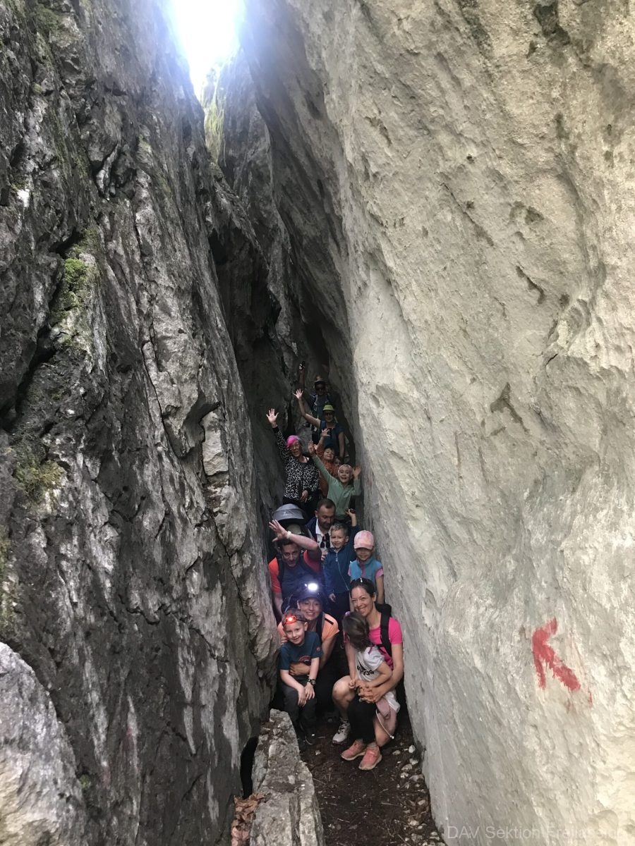 Zuerst ham ma uns in Freilassing getroffen und sind dann an Wolfgangsee. Für unsere dritte Tour heuer haben sich unsere Leiterinnen Josy und Kati den Plombergstein oberhalb vom Wolfgangsee ausgsucht. Wir sind der Meinung des war perfekt. Nach nur zehn Minuten Fußmarsch wren wir schon an unserem ersten Höhepunkt: Den Höhlen. Schnell haben wir die Stirnlampen rausgezogen und dann simma rein. Angst hat heut keiner ghabt – bis auf a paar Eltern, die unsere Geschwisterkinder in der Kraxn hatten – also, dass se sich an Kopf anhaun. Ja es war scho gscheid niedrig, aber so Entdecker Kinder hält halt nichts auf. Und zum Glück hat uns die Josy sicher durch des Höhlenlabyrinth geführt.