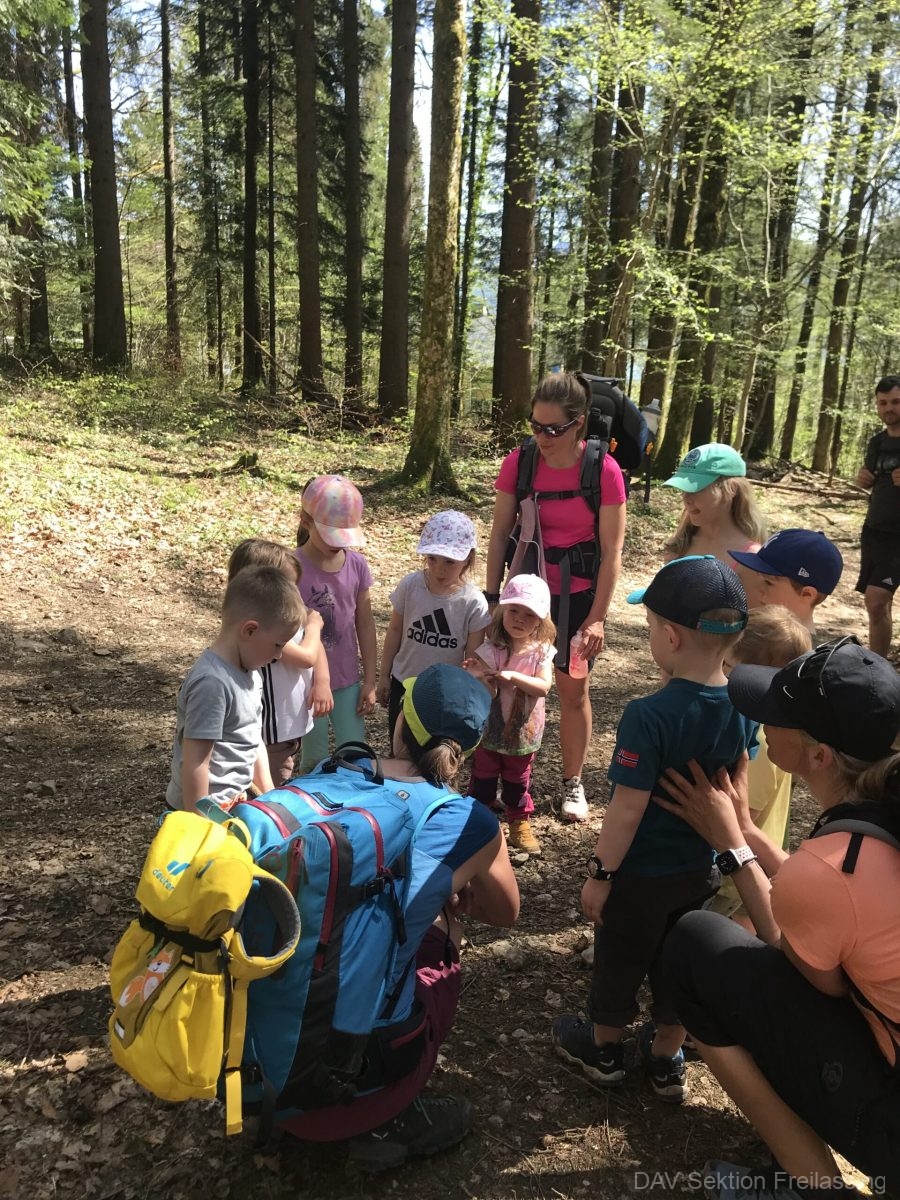 Oben am Gipfel gab’s zuerst a guade Brotzeit und dann hat sich Josy wieder a tolle Spiel einfallen lassen. Sie hat mit ihrem Kletterseil a paar Bäume miteinander verbunden. Dann mussten wir barfuß und blind den Weg und die Hindernisse ertasten und fühlen. A bissl gstupft ham die Nadeln scho no, aber a gscheider hält’s aus.