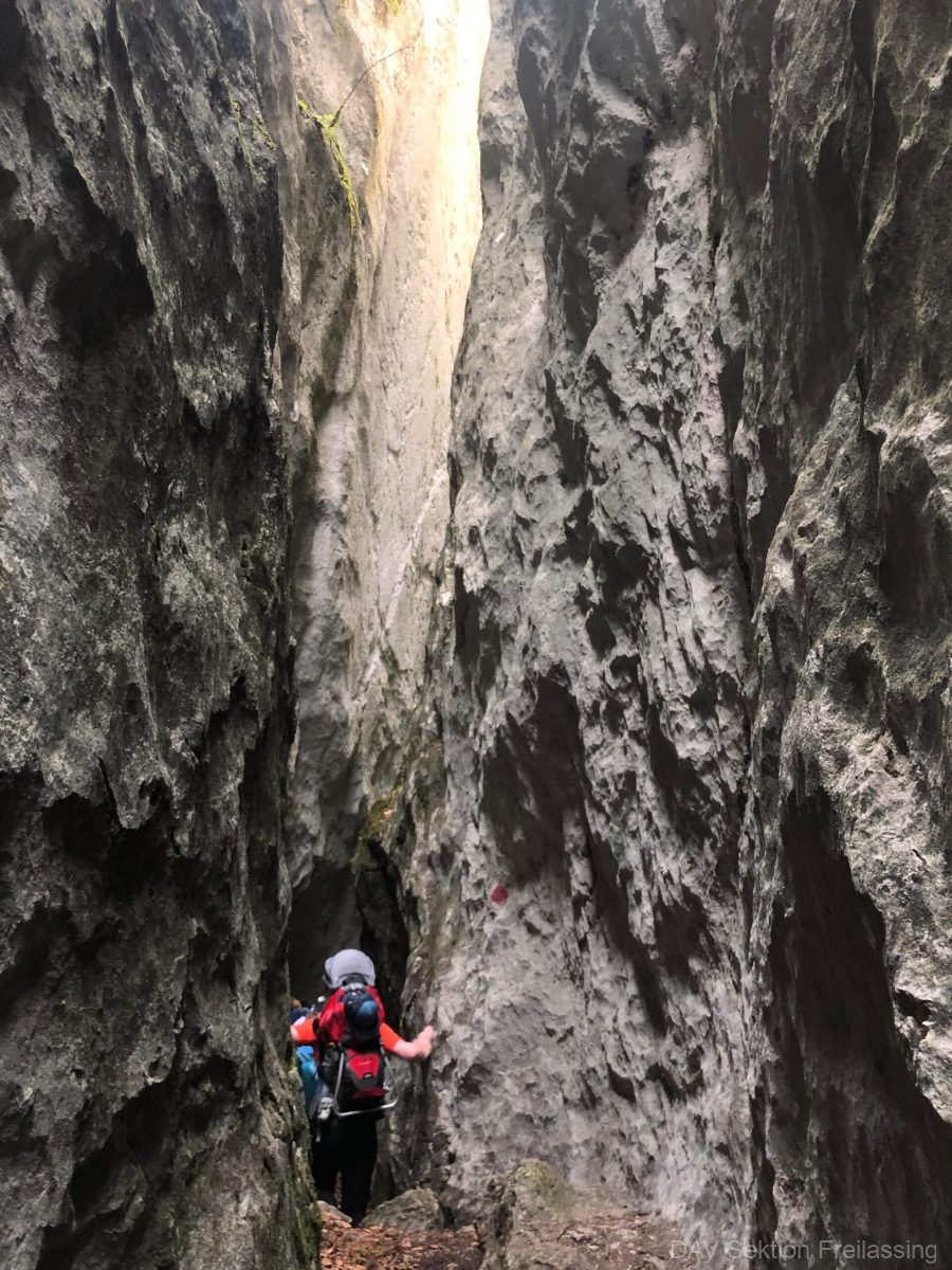 Zuerst ham ma uns in Freilassing getroffen und sind dann an Wolfgangsee. Für unsere dritte Tour heuer haben sich unsere Leiterinnen Josy und Kati den Plombergstein oberhalb vom Wolfgangsee ausgsucht. Wir sind der Meinung des war perfekt. Nach nur zehn Minuten Fußmarsch wren wir schon an unserem ersten Höhepunkt: Den Höhlen. Schnell haben wir die Stirnlampen rausgezogen und dann simma rein. Angst hat heut keiner ghabt – bis auf a paar Eltern, die unsere Geschwisterkinder in der Kraxn hatten – also, dass se sich an Kopf anhaun. Ja es war scho gscheid niedrig, aber so Entdecker Kinder hält halt nichts auf. Und zum Glück hat uns die Josy sicher durch des Höhlenlabyrinth geführt.