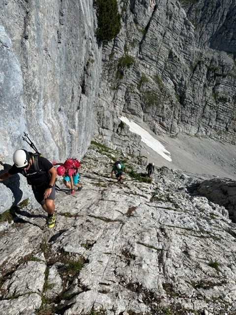 Dort angekommen zeigt sich dieser zunächst harmlos und das Gehgelände wechselt zwischen steilen Wiesen und Felsen. Mit der Zeit wird es immer mehr zum „hinglangen“. Die Kletterstellen sind jedoch einfach zu bewältigen und nicht wirklich ausgesetzt. Einmal geht man etwas ausgesetzt auf einer Platte um ein Eck und am Ende des Grates muss man von der Gratspitze ein bisserl ins „Nichts“ abklettern. Für die fitten Freilassinger Teilnehmer war das natürlich kein Problem.