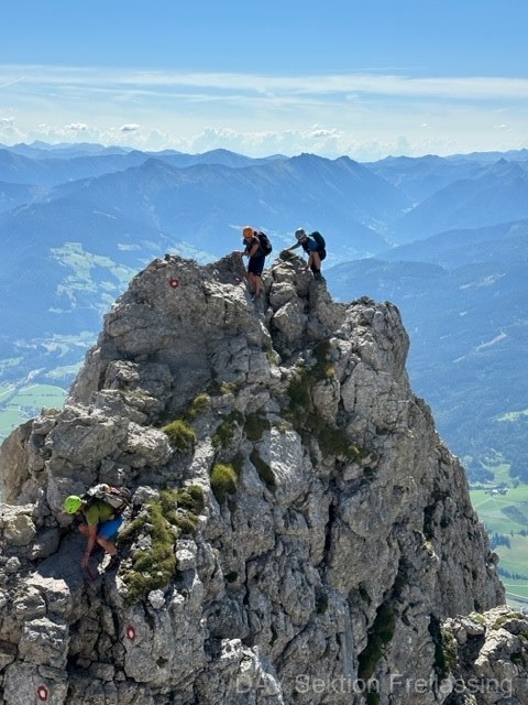 Dort angekommen zeigt sich dieser zunächst harmlos und das Gehgelände wechselt zwischen steilen Wiesen und Felsen. Mit der Zeit wird es immer mehr zum „hinglangen“. Die Kletterstellen sind jedoch einfach zu bewältigen und nicht wirklich ausgesetzt. Einmal geht man etwas ausgesetzt auf einer Platte um ein Eck und am Ende des Grates muss man von der Gratspitze ein bisserl ins „Nichts“ abklettern. Für die fitten Freilassinger Teilnehmer war das natürlich kein Problem.