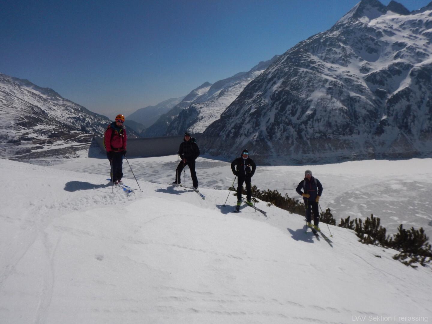 Zwei Teilnehmer entschieden sich für die nördliche Abfahrt, während die anderen Gruppenmitglieder  die Abfahrt zum Speichersee anpeilten. Harte Stellen, Windgangl, kleinere Latschengürtel aber auch Firn machten die Abfahrt interessant aber nicht schlecht zu fahren. Die letzten Meter Abfahrt wurden genossen und als es erneut hieß die Felle anzulegen legten wir davor in einem windstillen, sonnigen Bereich vor der imposanten Staumauer noch eine ausgiebige Mittagspause ein.