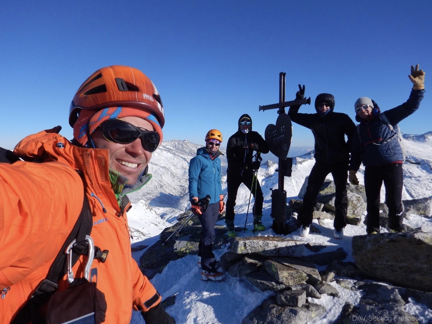 Zuerst sanft ansteigend und immer steiler werdend folgten wir der Skispur zur Kleinelendscharte hinauf. Windstill und von der Sonne gewärmt bewältigten wir die letzten Höhenmeter, ehe uns das Skidepot vom Keeskogel mit stürmischen kalten Wind empfing. Zügig wurde abgefellt, die Kleidungsschichten verdoppelt und dann stapften wir die letzten 100 Hm zu Fuß dem schönen Kreuz des Keeskogels (2886 m) entgegen. Die Freude war riesig und die tief stehende Sonnen tauchte die umliegenden Gipfel in ein tolles Licht.
