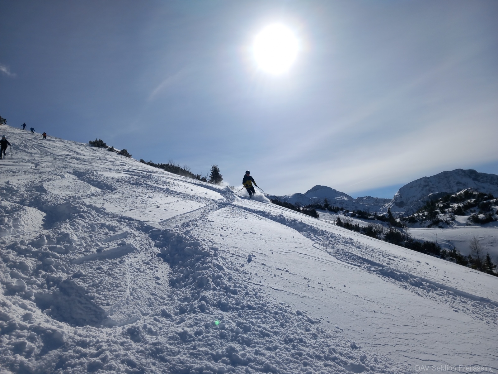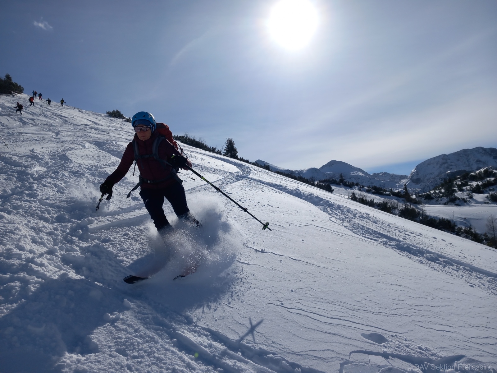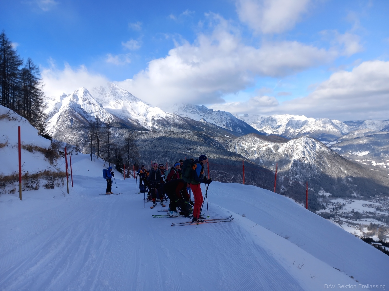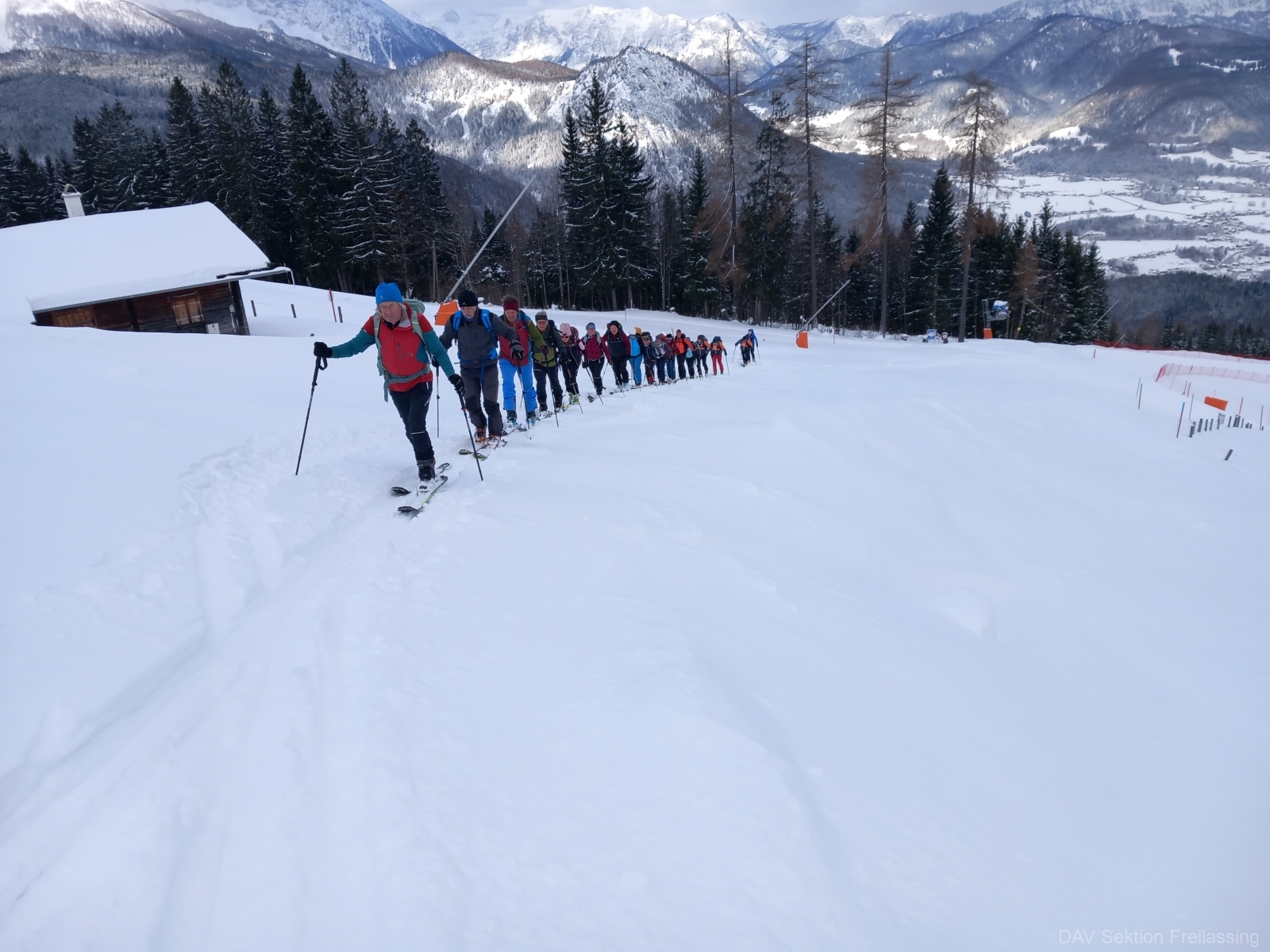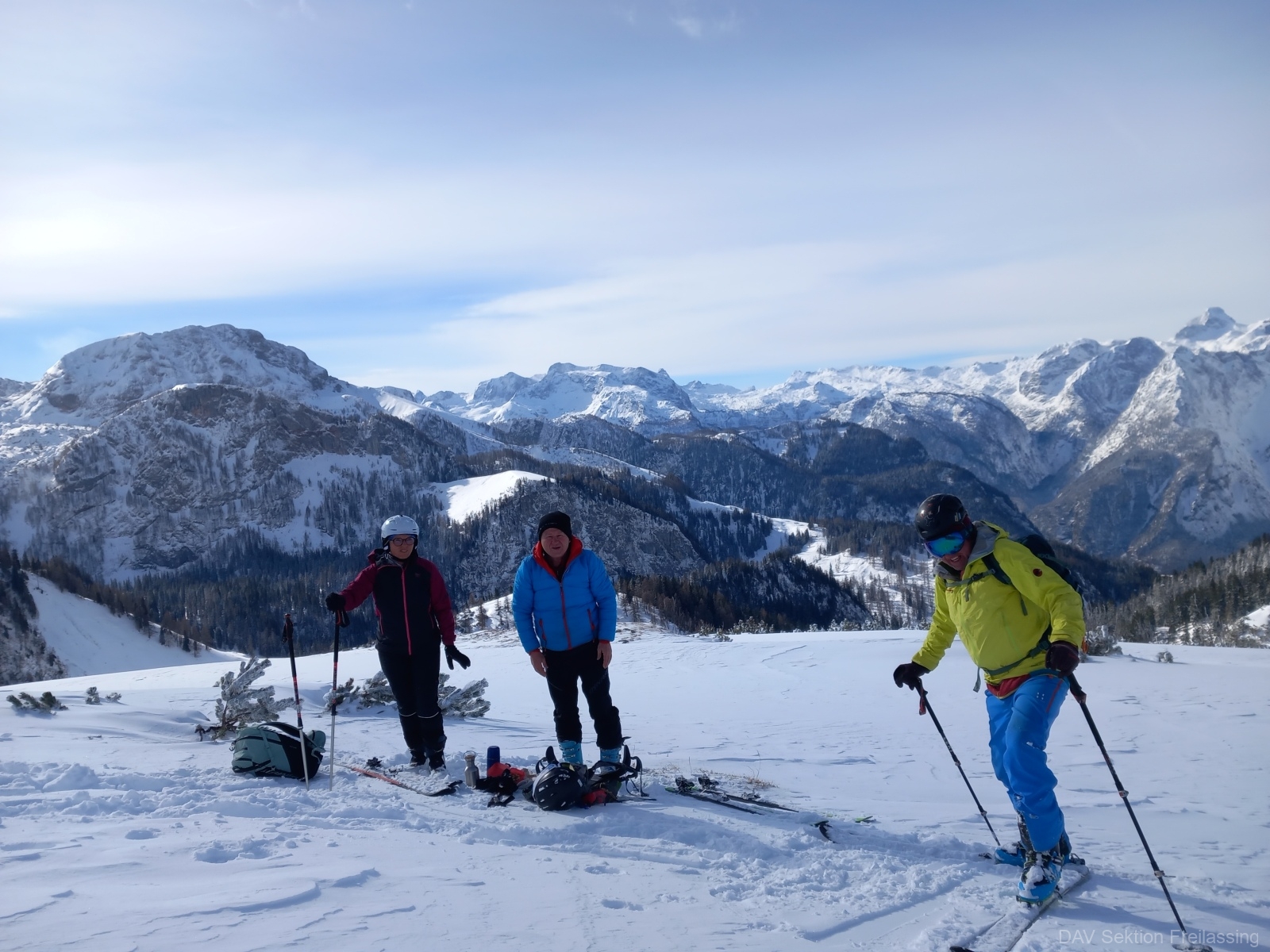 Die 18 Skitourengeher begannen den Aufstieg in Hinterbrand. Vorbei an der Mittelstation und über die Jennerwiese, erreichten sie den Mitterkaser und stiegen zunächst auf den Pfaffenkegel. Nach kurzer Pause konnte über den unverspurten Hang zum Mitterkaser abgefahren werden. Die Felle wurden noch einmal aufgezogen und die Tour zum Jenner vollendet. Auf der Sonnenterasse konnten die Kräfte wieder gesammelt werden, ehe es wieder hinunterging zum Ausgangspunkt. Es war ein herrlicher Skitag, mit Sonne und überraschend guten Schneeverhältnissen. Insgesamt wurden 1000 Höhenmeter in 2 ¾ Stunden überwunden.