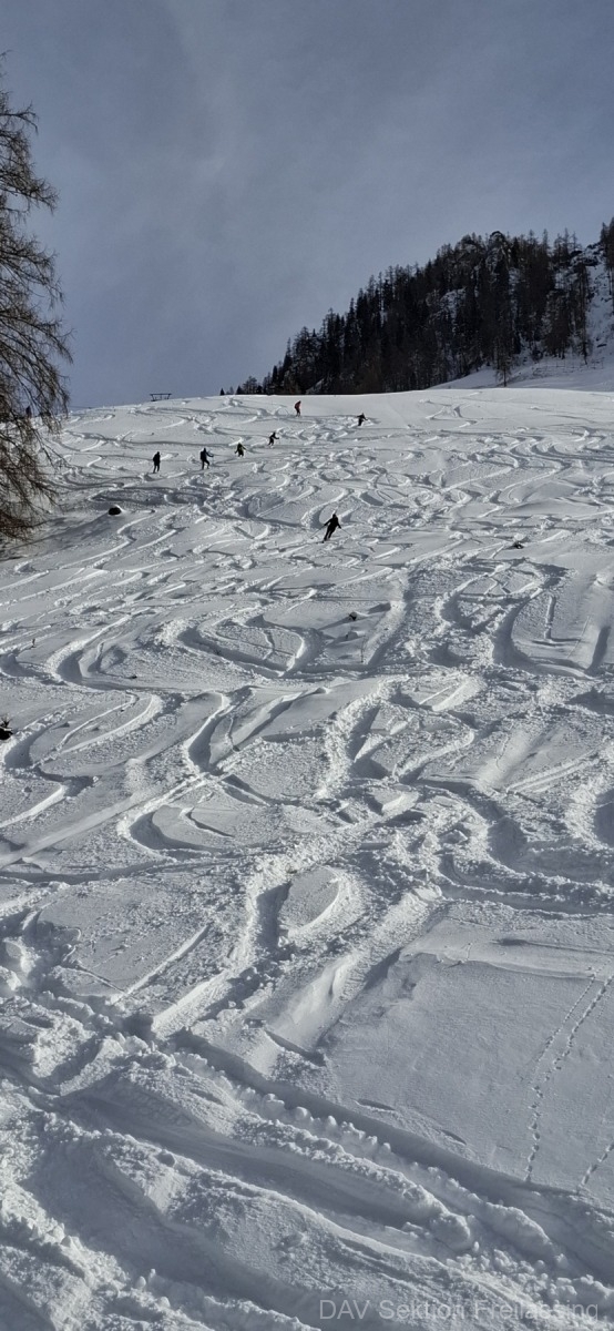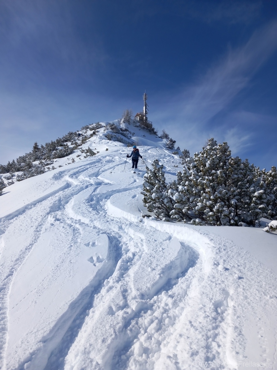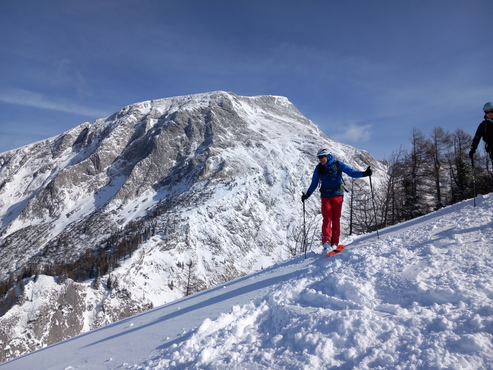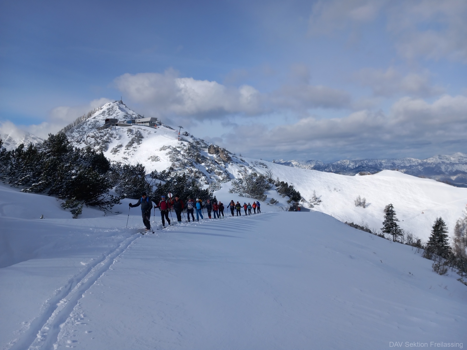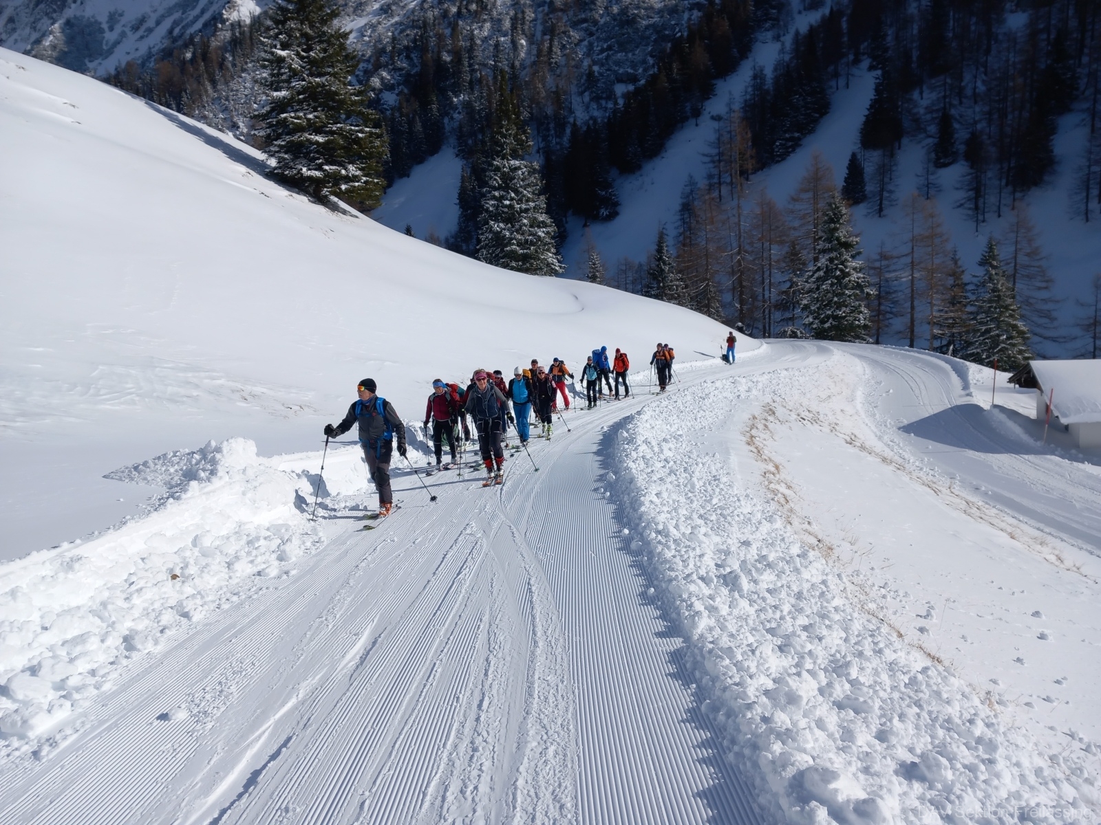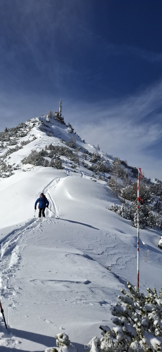 Die 18 Skitourengeher begannen den Aufstieg in Hinterbrand. Vorbei an der Mittelstation und über die Jennerwiese, erreichten sie den Mitterkaser und stiegen zunächst auf den Pfaffenkegel. Nach kurzer Pause konnte über den unverspurten Hang zum Mitterkaser abgefahren werden. Die Felle wurden noch einmal aufgezogen und die Tour zum Jenner vollendet. Auf der Sonnenterasse konnten die Kräfte wieder gesammelt werden, ehe es wieder hinunterging zum Ausgangspunkt. Es war ein herrlicher Skitag, mit Sonne und überraschend guten Schneeverhältnissen. Insgesamt wurden 1000 Höhenmeter in 2 ¾ Stunden überwunden.