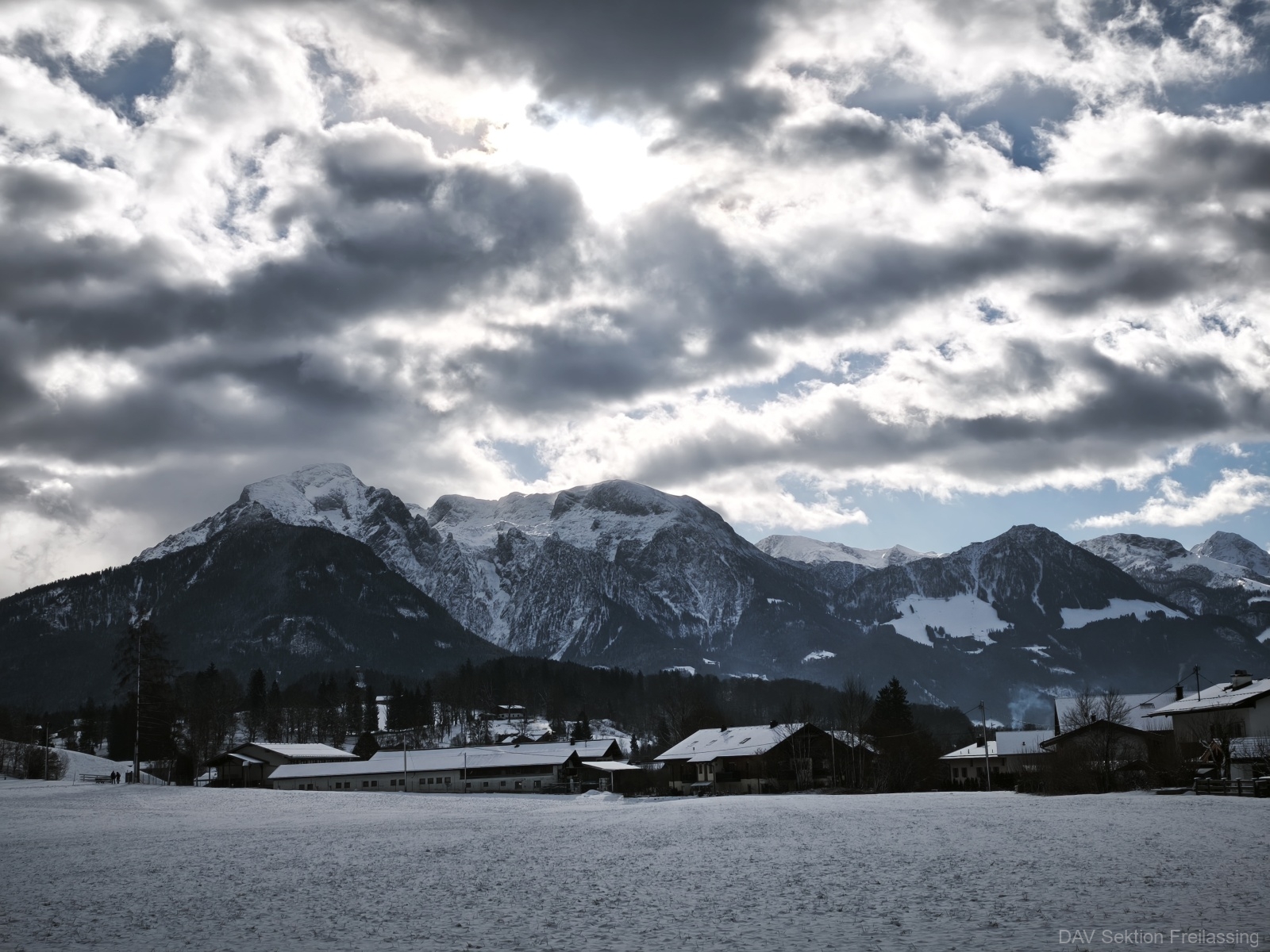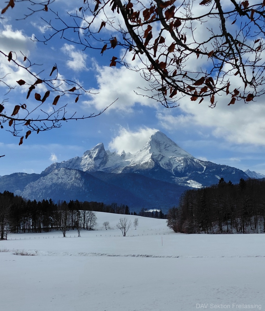 Geschickt genutzt haben die DAV-Senioren die Wolkenlücke am Vormittag für eine Rundwanderung in und um Bischofswiesen. 18 Männer und Frauen starteten an der Kirche. Auf aperen bzw. frisch geräumten Wegen ging es dem Aschauer Weiher zu, voll Bewunderung für die herrliche frisch verschneite Kulisse von Watzmann und Hochkalter. Vom Kreisverkehr Richtung Stanggass, teils über schneebedeckte Wiesen ging es hinunter zur Bahnlinie bzw. zur Bischofswieser-Ache. Dieser entlang flußaufwärts, dann wieder zurück zum Ausgangspunkt. Die gesellige Einkehr auf dem Heimweg durfte aber trotz Fastenzeitbeginn nicht ausfallen. Bei der Runde wurden 7 km zurückgelegt, 200 Höhenmeter überwunden und dauerte 2 ½ Stunden.