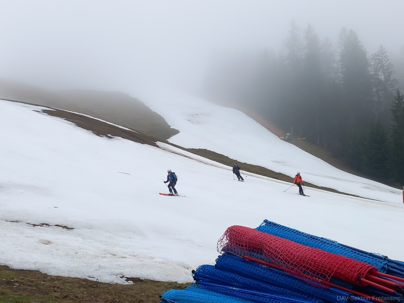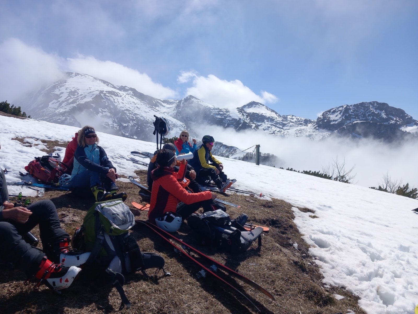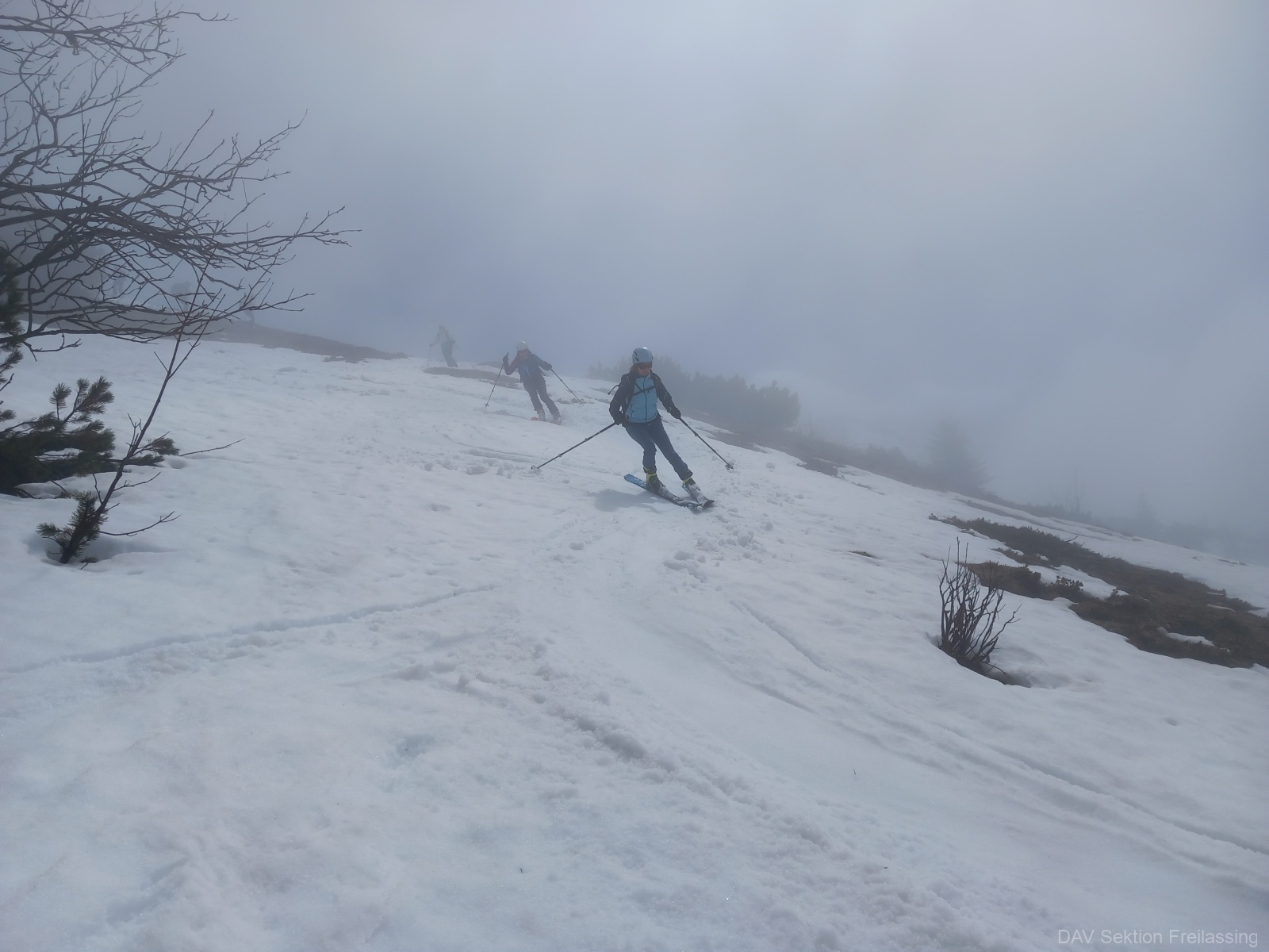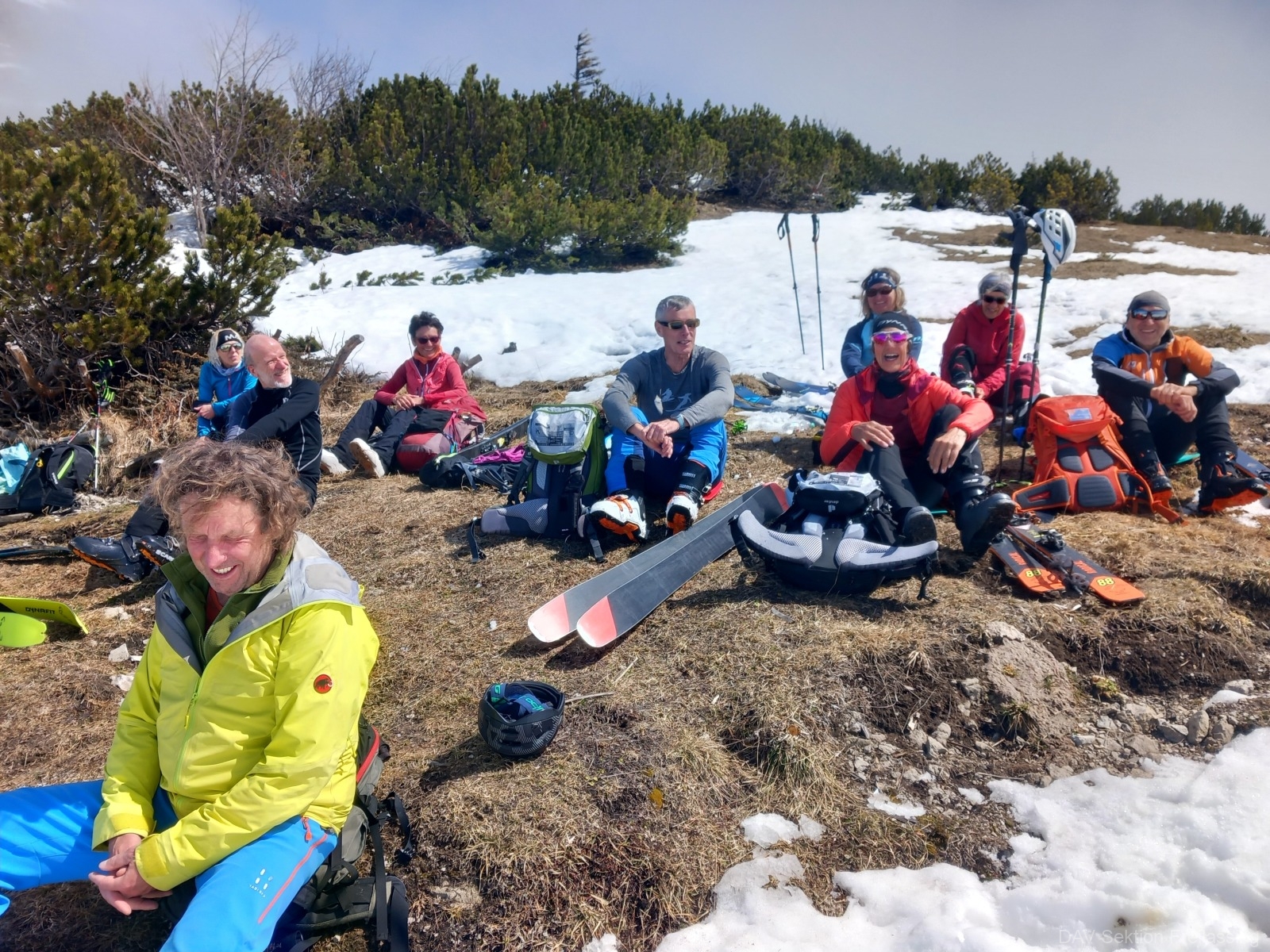 Nach dem kurzen Anmarsch zur Mittelstation konnte über den Krautkaserhang mit Ski aufgestiegen werden. Leider begleitete dichter Nebel die Gruppe, der sich auch bis zum Stahl Haus nicht lichtete. Kurz vor dem Teufelsgemäuer war nach zweistündigem Aufstieg das heutige Ziel auf einer Kuppe erreicht. Nach einer kurzen Rast wurde in sehr weichem Schnee durch lichten Lärchenwald zum Schneibsteinhaus abgefahren. Auf dem Wanderweg zur Bergstation des aufgelassenen Pfaffenkegelliftes mussten die Ski getragen werden. Die Gipfelrast konnte dann bei Sonnenschein genossen werden. Bei der Abfahrt tauchten die Skifahrer wieder in dichten Nebel ein, der den Abfahrtsgenuss aber nicht schmälern konnte. Die Abschlusstour hätten sich die Teilnehmer schon besser gewünscht. Zurückblickend waren aber alle mit der Skitourensaison sehr zufrieden.