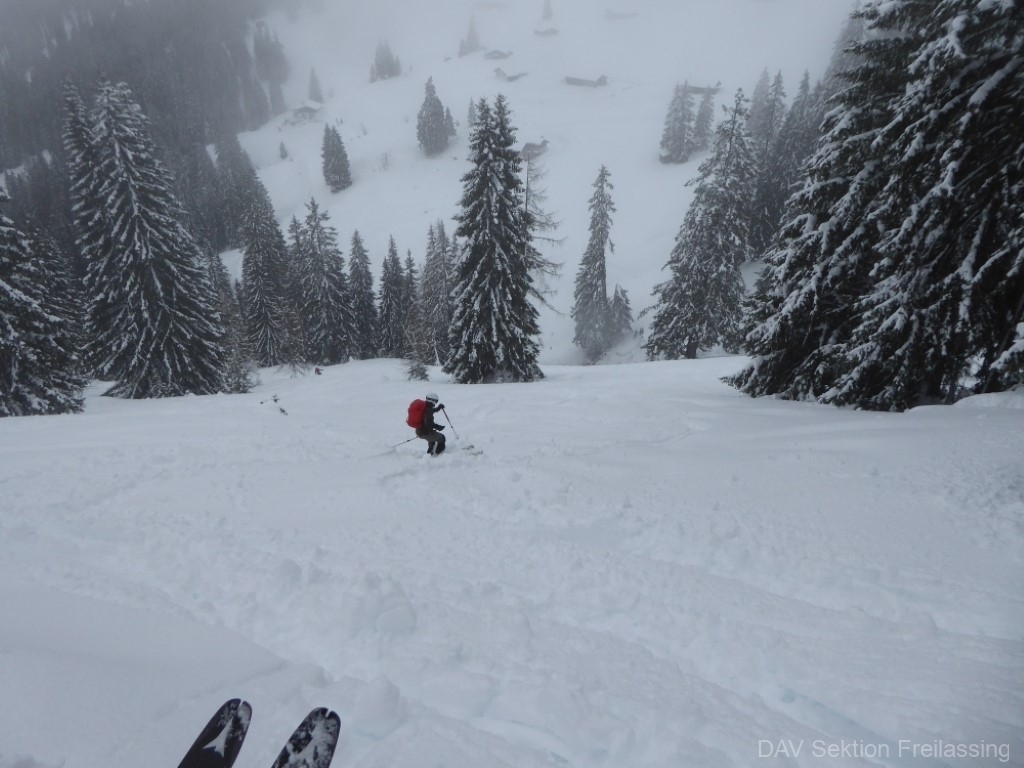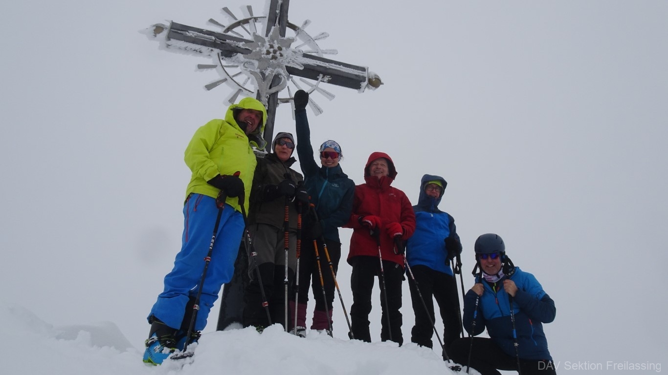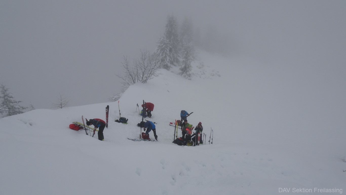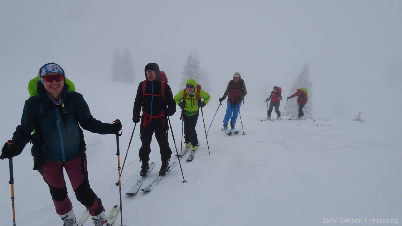 Die fünf Teilnehmer und zwei Tourenbegleiter – begleitet von zwei Schlittenfahrerinnen mit Ziel Jausenstation Hochalm – wurden anfangs für eine halbe Stunde erstmal ordentlich eingenässt. Selbst auf über 1.000 m war die Temperatur deutlich im plus-Bereich. Nach der Geschwendter Alm tauchten wir in die Wolken ein, was der Sicht nicht gerade förderlich war. Glücklicherweise blieb zumindest der angekündigte Wind aus. Richtig angenehm war es allerdings nicht, daher wurde die Gipfelpause auf den Fellwechsel reduziert. Die Abfahrt erforderte aufgrund der fehlenden Konturen ein besonderes Gefühl für Bewegung und Gleichgewicht. Wir fanden aber einen schönen, unverspurten Hang, der sich trotz feuchten und schweren Schnees recht gut fahren ließ. Der Einkehrschwung auf der Hochalm durfte nicht fehlen – mit dem Nebeneffekt, dass wir uns etwas trocknen konnten. Dort trafen wir auch die beiden Schlittenfahrerinnen. Die anschließende Abfahrt zum Parkplatz war zum Glück nicht so nass wir der Aufstieg. Die Teilnehmer waren trotz der ungünstigen Bedingungen sehr zufrieden mit der Alternativtour.