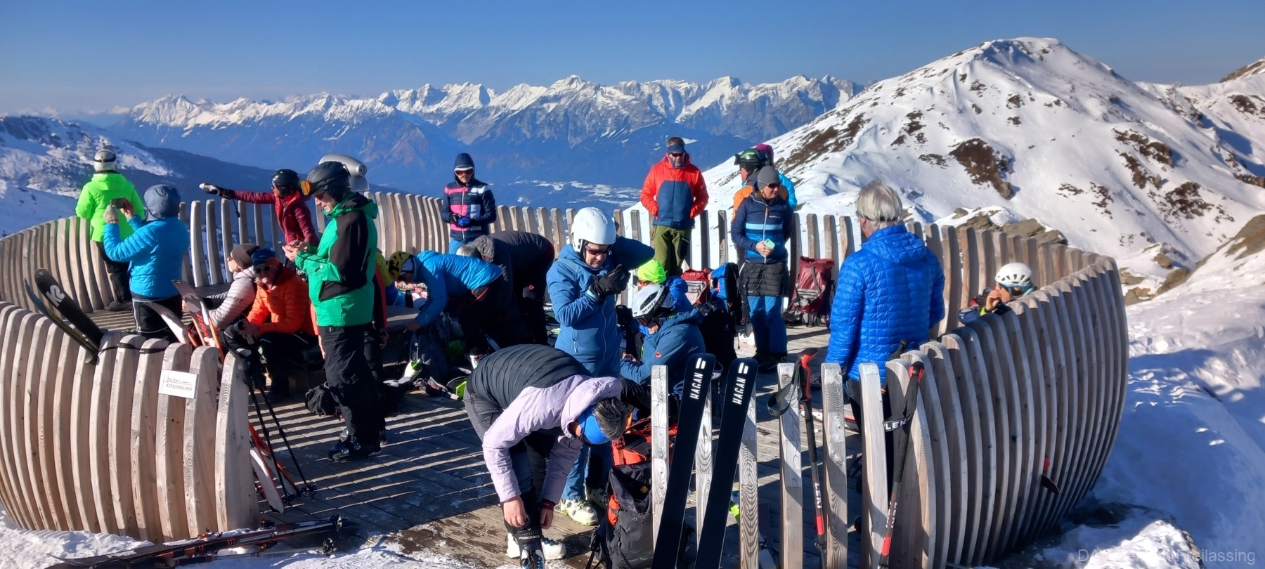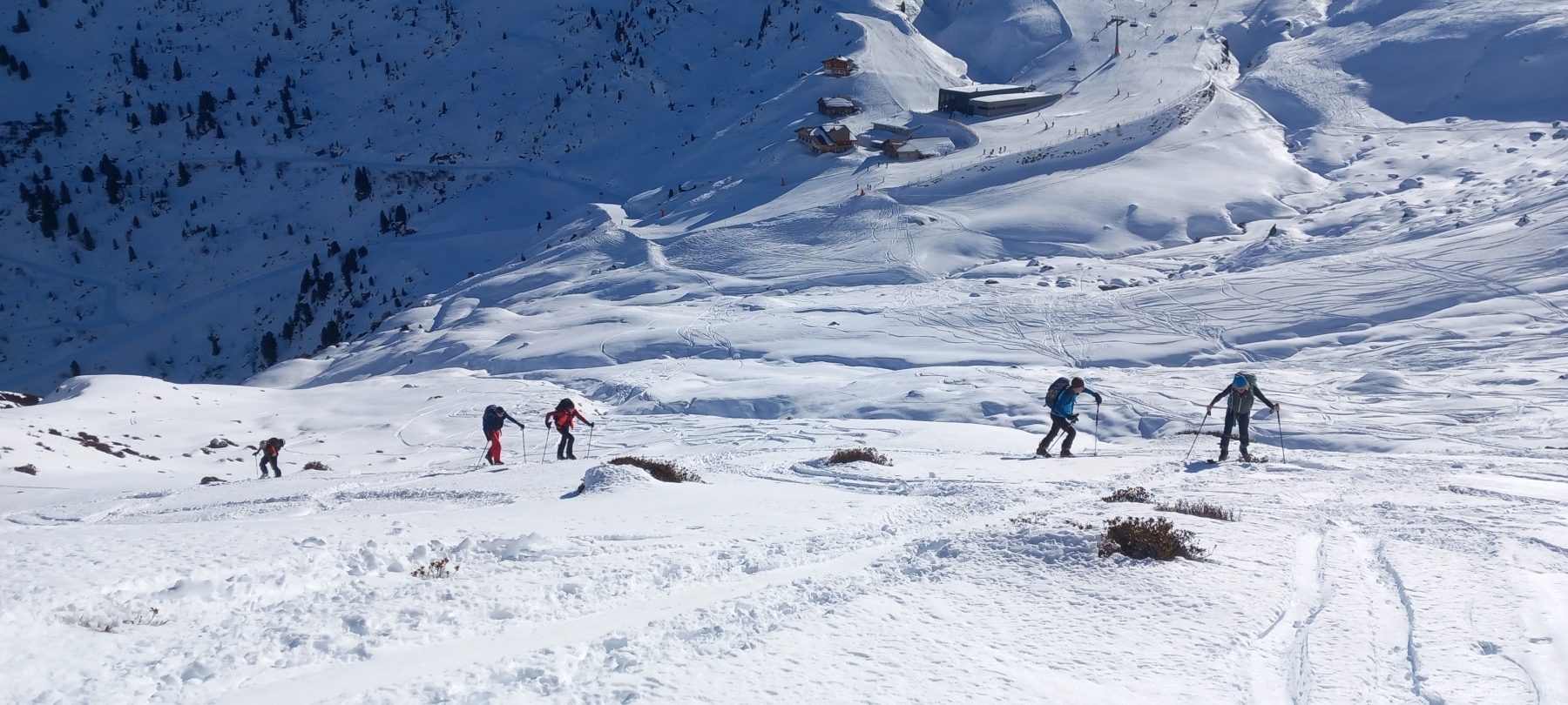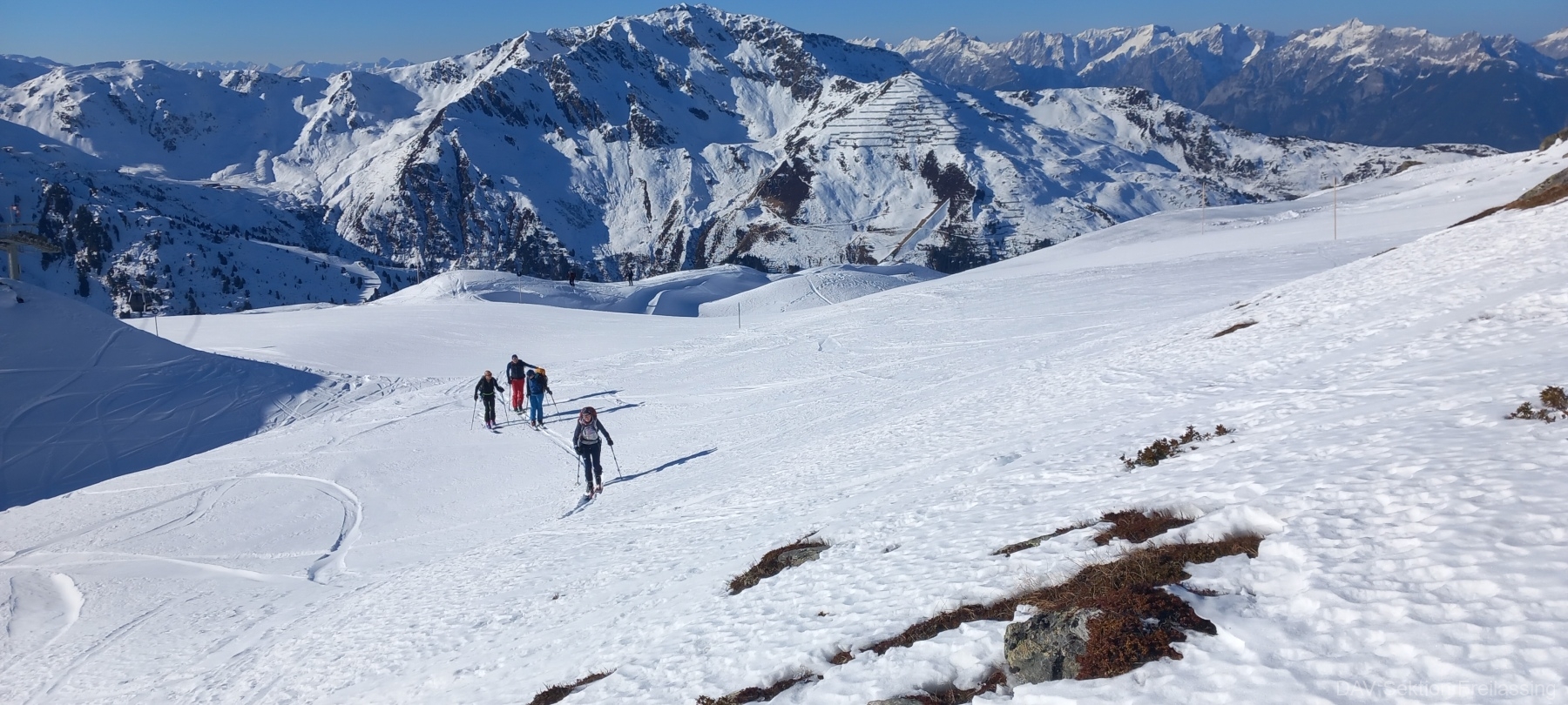Die Autos wurden am Hotel geparkt und mit dem Skibus, den wir auch an allen anderen Tagen benutzten, ging es hinauf zur ersten Tour. Um einen ersten Überblich zu bekommen, fiel die Entscheidung auf eine Pistentour zum Pfaffenbichl (2400 m). Für die 900 Höhenmeter wurden 2 ½ Stunden benötigt. Auf den sehr gut präparierten Pisten führte die Abfahrt hinunter zum Ausgangspunkt.
