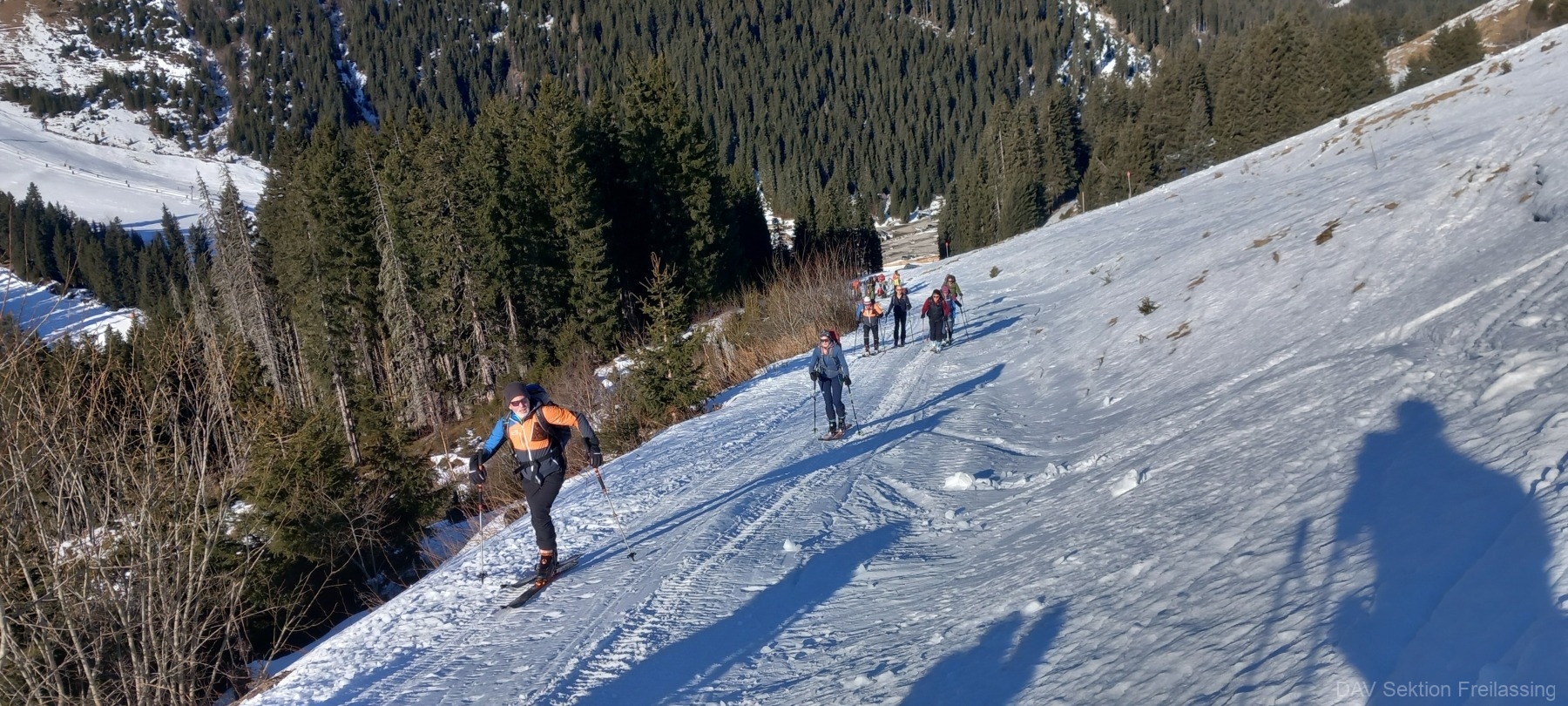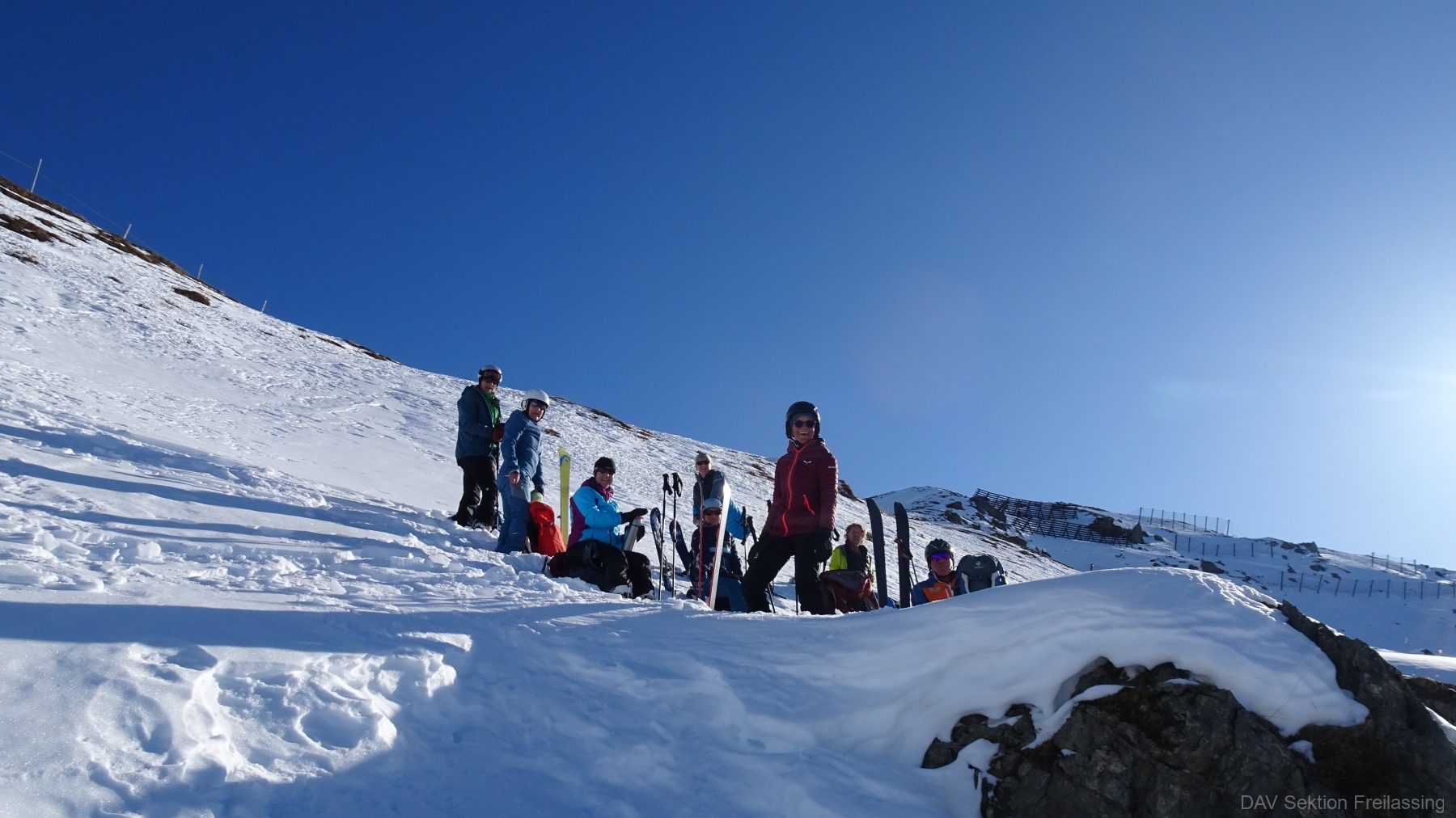 Am letzten Tourentag stiegen alle gemeinsam hinauf zum Sonntagsköpfl (2244 m). Über eine Forststraße und lichtem Wald führte der Weg hinauf zu sehr schönem Skigelände und schließlich zum Gipfelkreuz des Sonntagsköpfl. Die 800 Höhenmeter wurden in 2 ½ Stunden überwunden. Die Abfahrt bot den Skifahrern alles. Von lockerem Pulverschnee bis zu abenteuerlichen Waldpassagen war alles dabei.