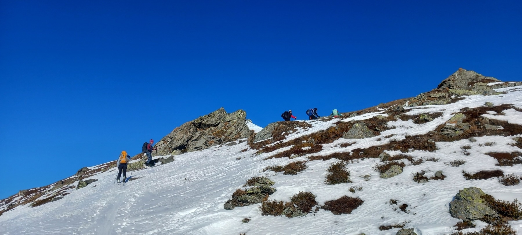 Am zweiten Tag wurde noch einmal auf eine Pistentour entschieden. Diesmal konnte aber im Aufstieg oft über freies Gelände zum Hüttenkogel (2380 m) aufgestiegen werden. Wieder waren es 900 Höhenmeter in 2 ½ Stunden. Eine lange Querfahrt brachte die Gruppe ins Skigebiet von Hochzillertal mit der langen Abfahrt über 1850 Höhenmeter hinunter nach Kaltenbach. Der kostenlose Skibus brachte die Skifahrer zurück zum Quartier.