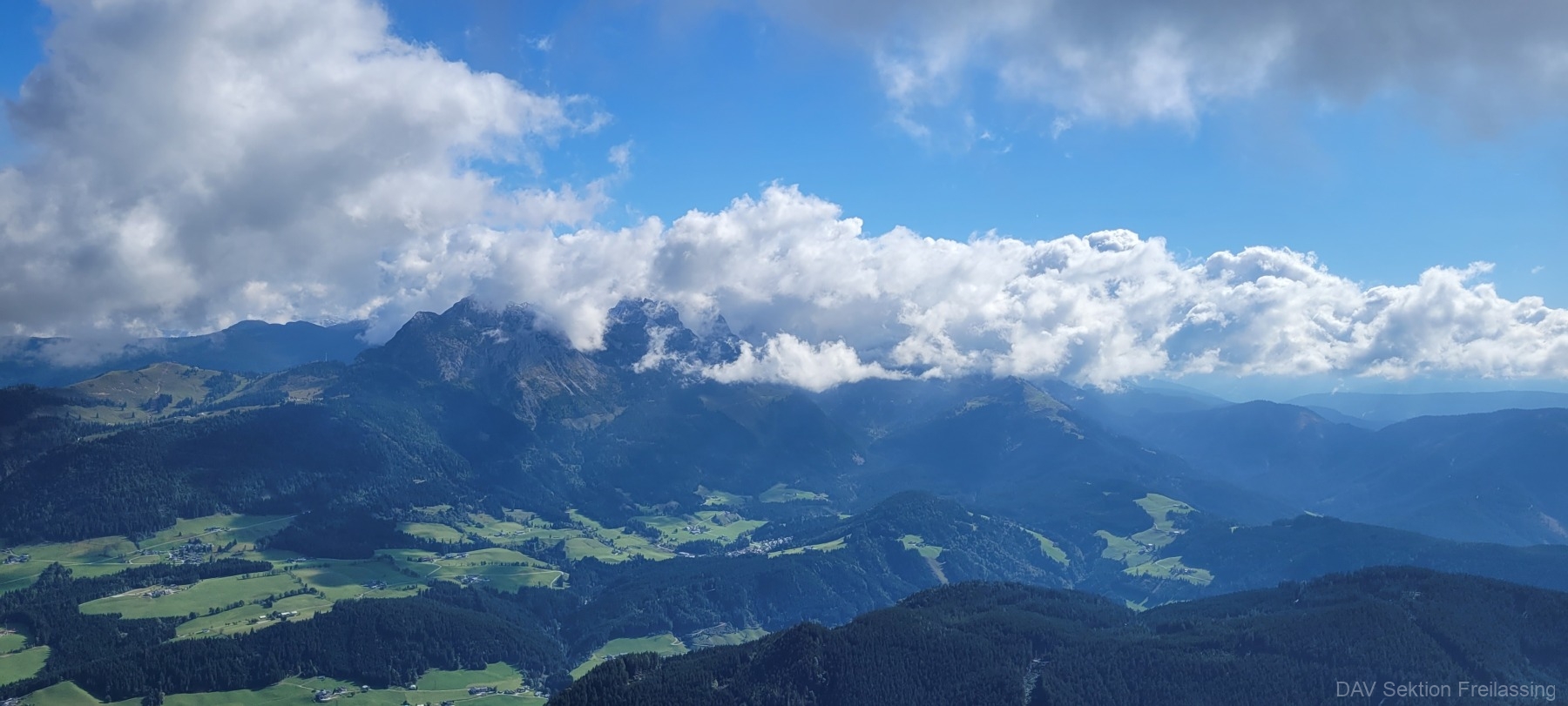 Die zügigere Gruppe, die den Schober (1.810 m) in Angriff nahm, bekam einen kleinen Vorsprung. In einem Wechsel von Forststraßen, Wiesen und Steigen kam die Gruppe unterhalb des Schobers an die Abzweigung, die in 1 ¼ Stunden auf den Gipfel führte (genau genommen sind es zwei Schober-Gipfel, die ca. eine Viertelstunde voneinander entfernt sind). An derselben Abzweigung nahm die andere Gruppe den Weg weiter Richtung Gsenghöhe/Berliner Kreuz (1.603 m) mit Abstecher zur Gwechenberghütte.