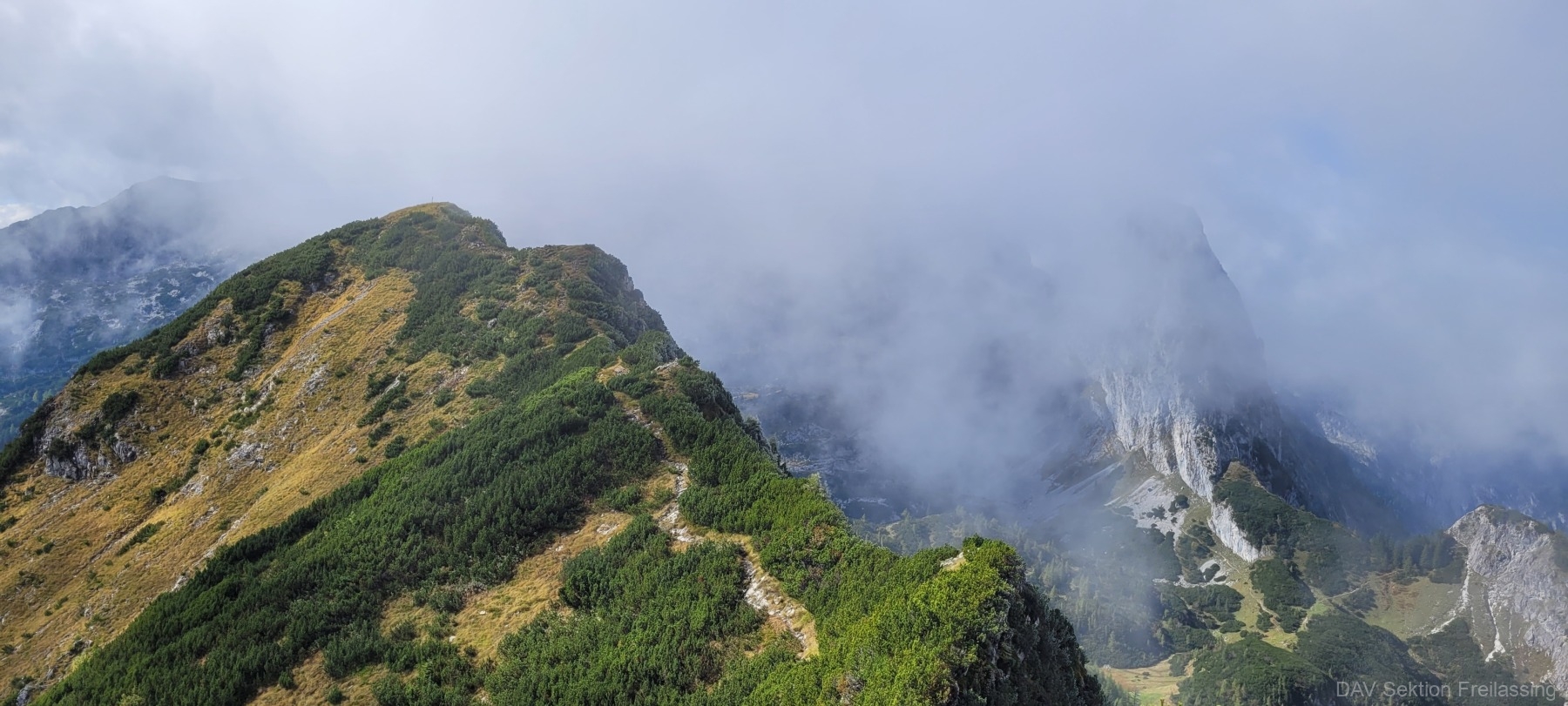 Das Wetter war etwas durchwachsen und recht frisch; die Sicht hätte besser sein können. Sonne, Nebel, Wolken und ein kurzer, sanfter Schneefall (ehrlich !) wechselten sich ständig ab. Am Tag davor hatte es stark geregnet; dadurch waren zumindest die Steige teilweise sehr rutschig. Es gab dennoch keine Verluste 😉