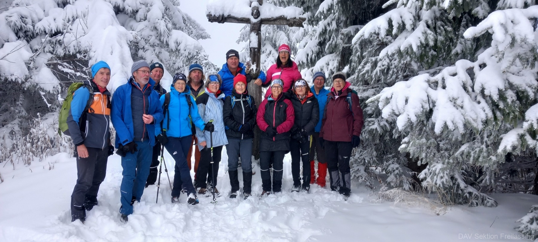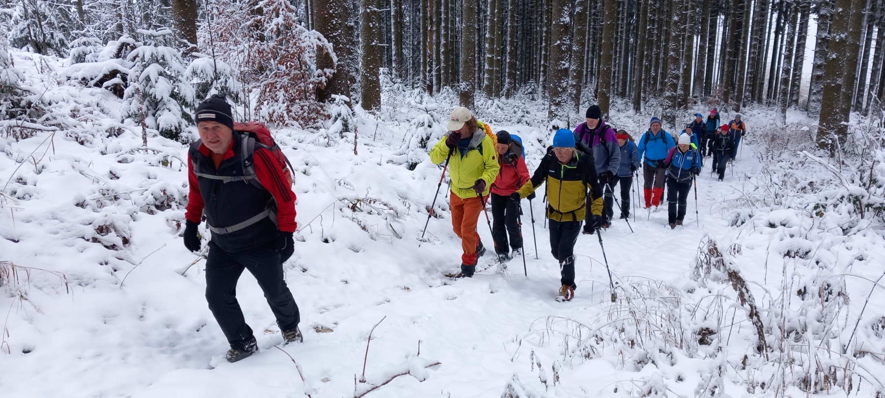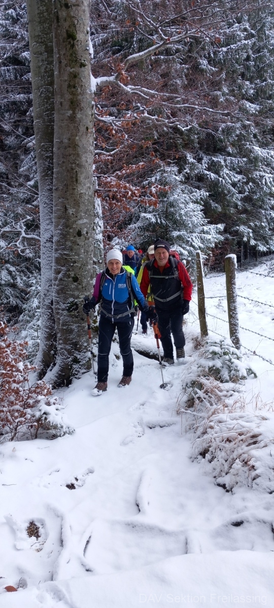 Am 26.11.2025 war es wieder soweit. Der winterliche Wetterbericht machte die Auswahl der Seniorentour einfach. 19 Teilnehmer nahmen die Einladung an und starteten am Wanderparkplatz in Neuhaus. Auf leicht verschneiten Wegen ging es über die „Schneid“ dem Gipfel entgegen. Mit zunehmender Höhe wuchs auch die Schneedecke. Zum Schluss musste durch knietiefen Schnee gespurt werden. Nach 2 Stunden waren die 570 Höhenmeter überwunden und das Gipfelkreuz war erreicht. Die Gipfelrast war nur sehr kurz. Es lockte die Einkehr im Winterraum der Stoißer Alm, wo wir schon erwartet wurden. Bei guter Verpflegung und wärmenden Glühwein herrschte eine ausgelassene Stimmung. Gut erholt ging es wieder hinaus in die Kälte und auf der Forststraße in 1 ½ Stunden hinunter zum Parkplatz.