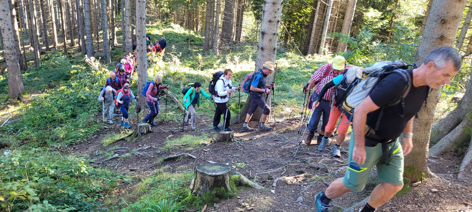 Die am 25.09.2024 durchgeführte Seniorentour führte über den Gipfel des Teisenbergs (1.333 m) rüber zur bekannten und beliebten Stoißer Alm. Bei Feilenreit, wo noch weitere tapfere DAVler dazustießen, wollten wir einen neuen Weg kennenlernen. Wir starteten dann mit rekordverdächtigen 40 Wanderern. Der Weg auf abwechslungsreichen Steigen sowie auf Forst- und Wanderwegen vorbei am kleinen und großen Kachelstein hinüber zum Gipfel, wo wir kurz rasteten und Fotos machten. An der bewirtschafteten Stoißer Alm konnten wir gemütlich einkehren und das herrliche, sonnige Wetter genießen. Der Abstieg führte uns dann auf unmarkierten, teilweise etwas rutschigen und zugewachsenen Steigen an der Rohrmooshütte und den beiden Sieberseen vorbei Richtung Ausgangspunkt am Parkplatz.