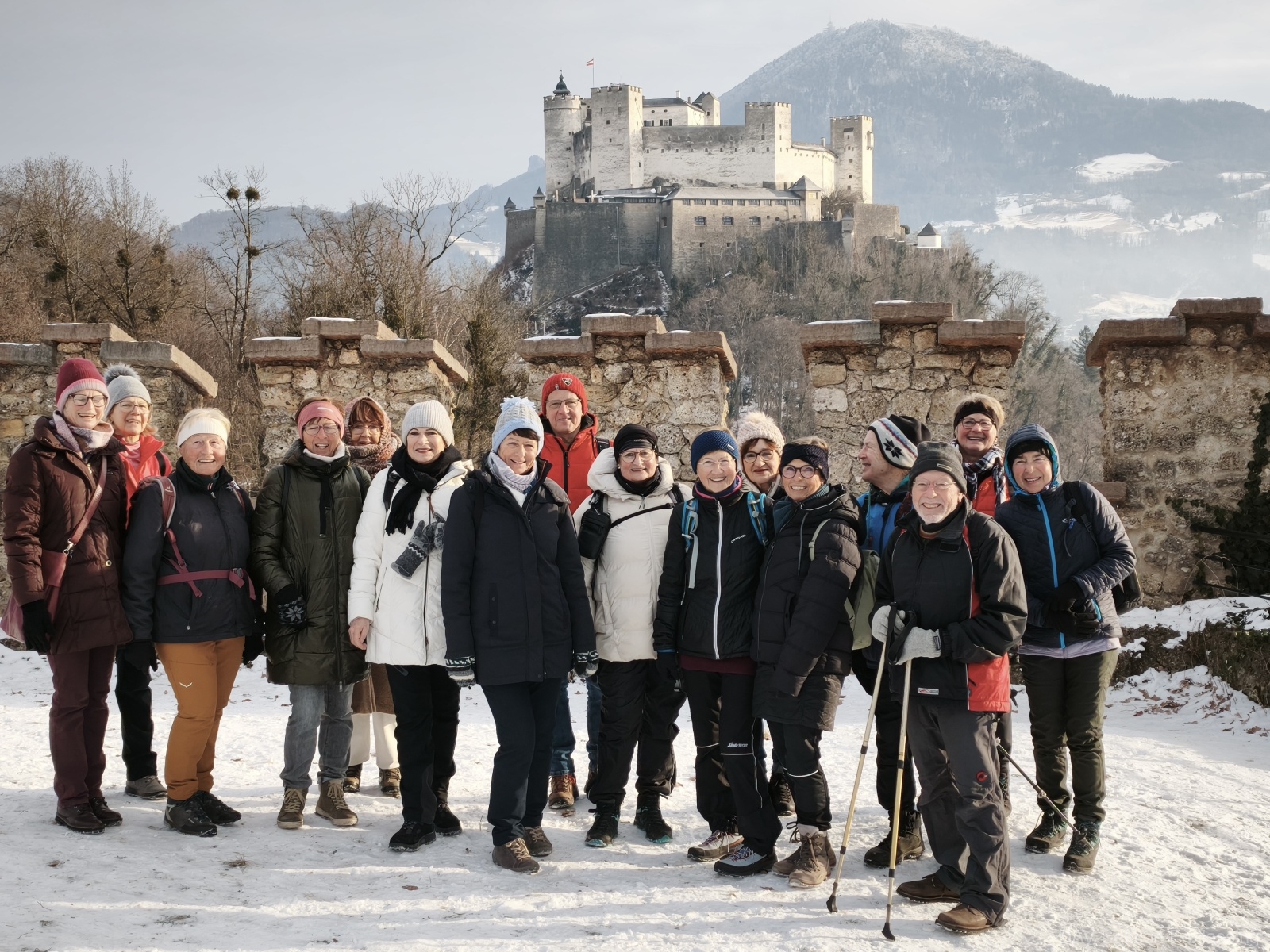 Am 07.01.2026 unternahmen 16 Senioren einen Ausflug zu den nahegelegenen Salzburger Hausbergen. Die Anreise nach Salzburg wurde per ÖPNV vorgenommen. In Mülln angekommen ging es gleich beim Augustinerbräu rechts den Mönchsberg hinauf. (Der Ortsteil Mülln hat seinen Namen von den vielen „Mühlen“ die damals noch in Betrieb waren, die Red.) Die eiskalte Witterung ließ schon gleich in der Frühe traumhafte Blicke auf die Stadt, die Festung und auch auf die etwas weiter entfernt liegende Bergwelt zu. Der erste Zwischenstopp war an der sog. Richterhöhe, wo auch das Gruppenbild entstand. Anschließend ging es weiter Richtung Stupa.