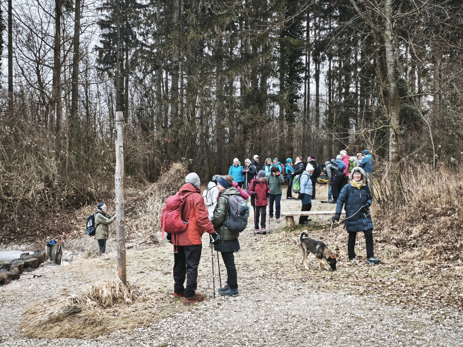 Am Mittwoch, den 04.02.2026 trafen sich 27 Wanderer und ein Hund um in Richtung Oberndorf die Salzachauen in Weitwörth, bei ziemlich trübem und kalten Winterwetter, zu erkunden. Die Strecke entlang des Auenerlebnisweges war teilweise recht vereist und nur mit Grödeln zu bewältigen. Bis auf einen kleinen Ausrutscher am Ende der Tour gab es keine Verluste.