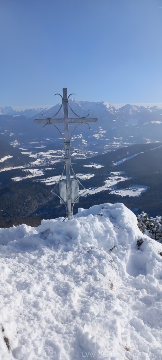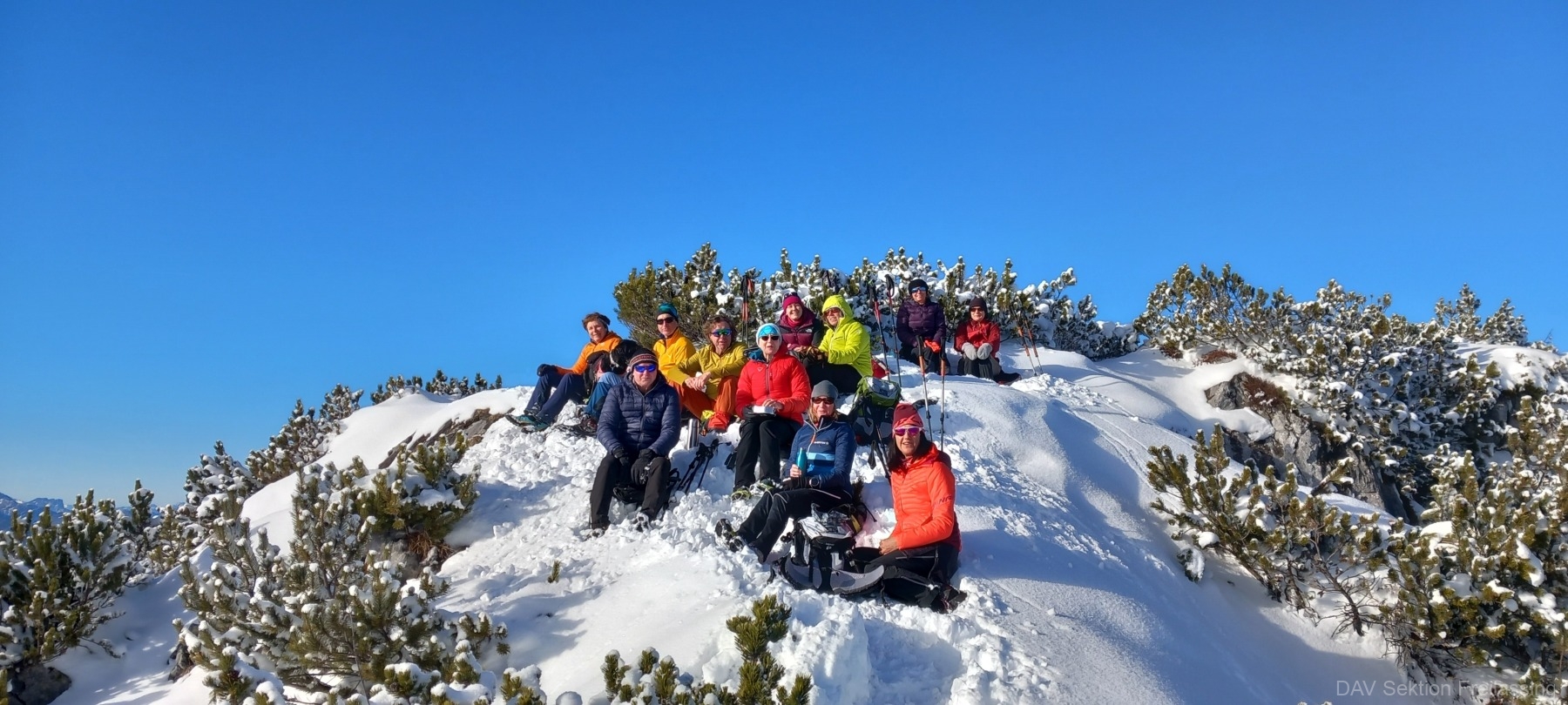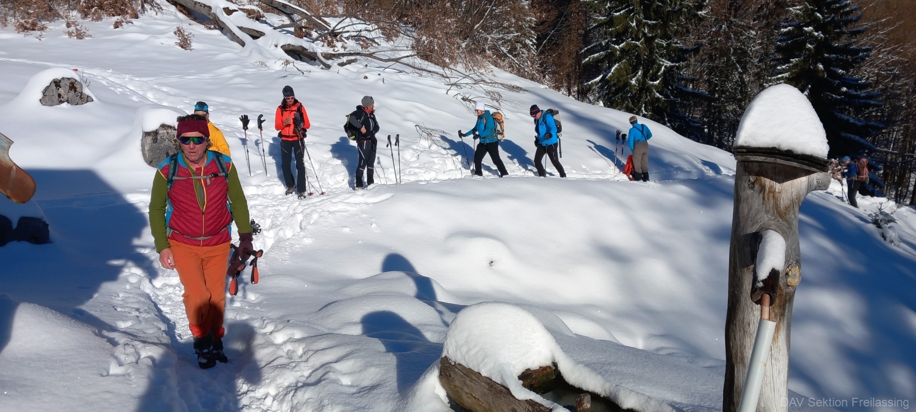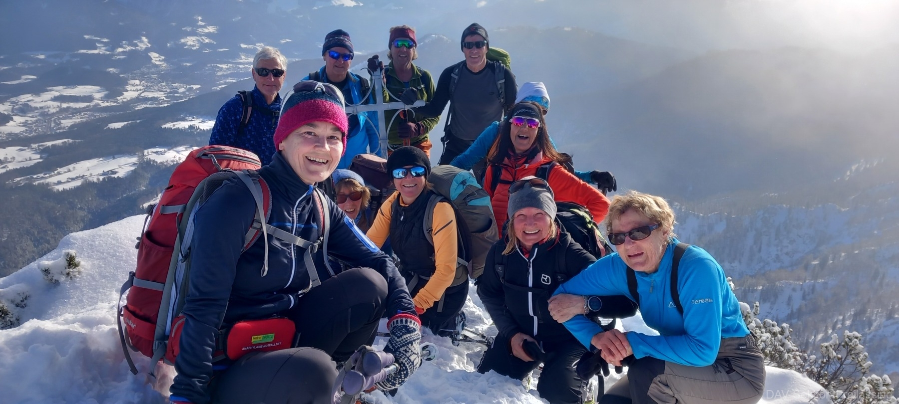 Bei ordentlichen Minusgraden ging es am Parkplatz beim Klaushäusl los. Auf dem Weg am Plaiklehen vorbei wurden aber schnell die ersten wärmenden Sonnenstrahlen erreicht. Eine herrliche unverspurte Winterlandschaft bot sich den 12 Bergsteigern. Oberhalb des Saurüssels traf die Gruppe auf den gespurten Weg zum Mitterkaser. Auch der Weiterweg zur Bergwachthütte und zum Gipfel war bereits begangen. Nach 1050 Höhenmeter und 2 ¾ Stunden Aufstieg konnte das Panorama bei der Gipfelrast und angenehmen Temperaturen genossen werden. Auf dem Anstiegsweg erfolgte der Abstieg hinunter zur Forststraße und über den Saurüssel weiter zum Parkplatz.